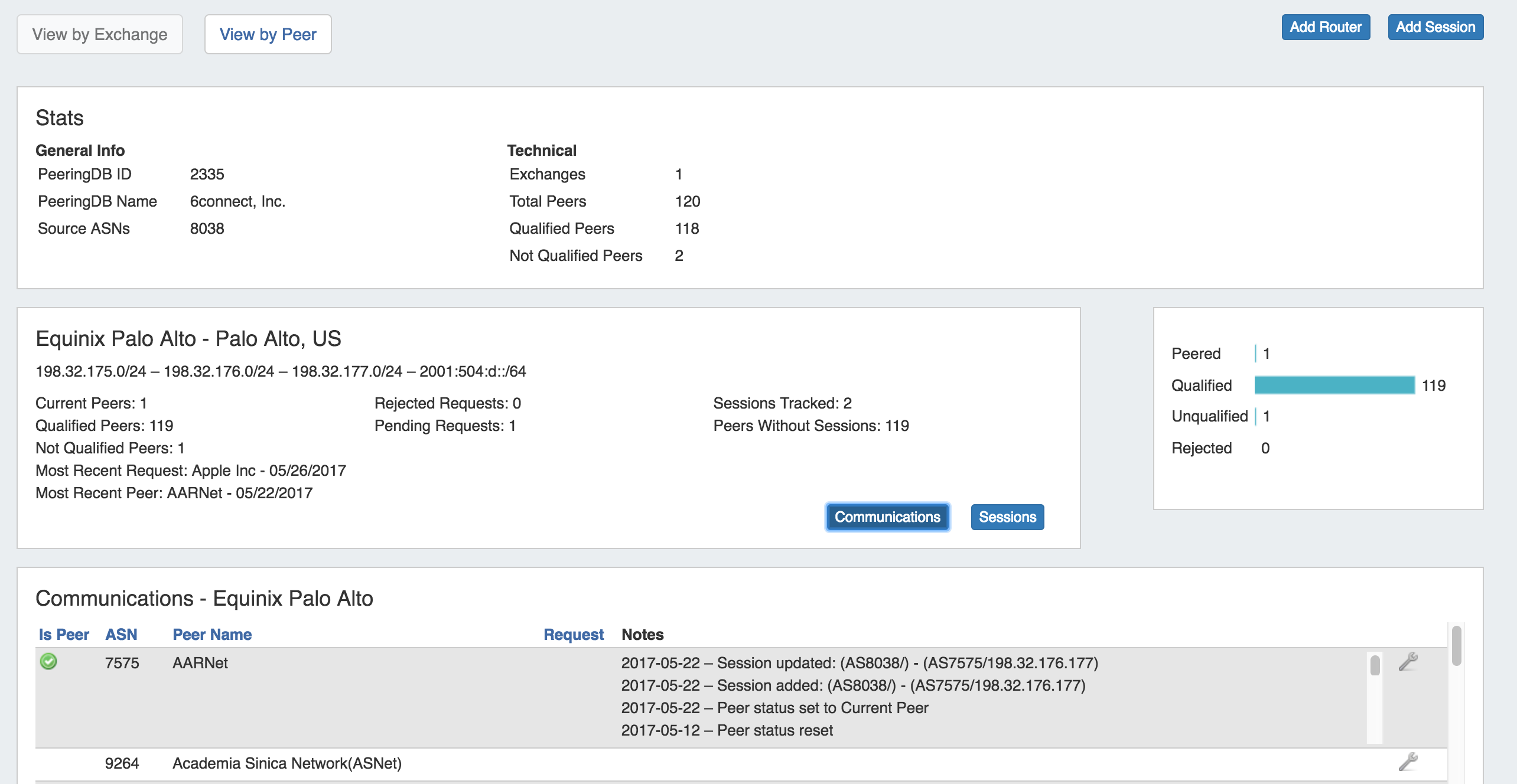 Below that are modules for specific exchanges - here, we can see peer and session breakdowns for Equinix Palo Alto, including a bar chart of Peered / Qualified / Unqualified  / Rejected status types.