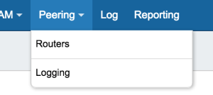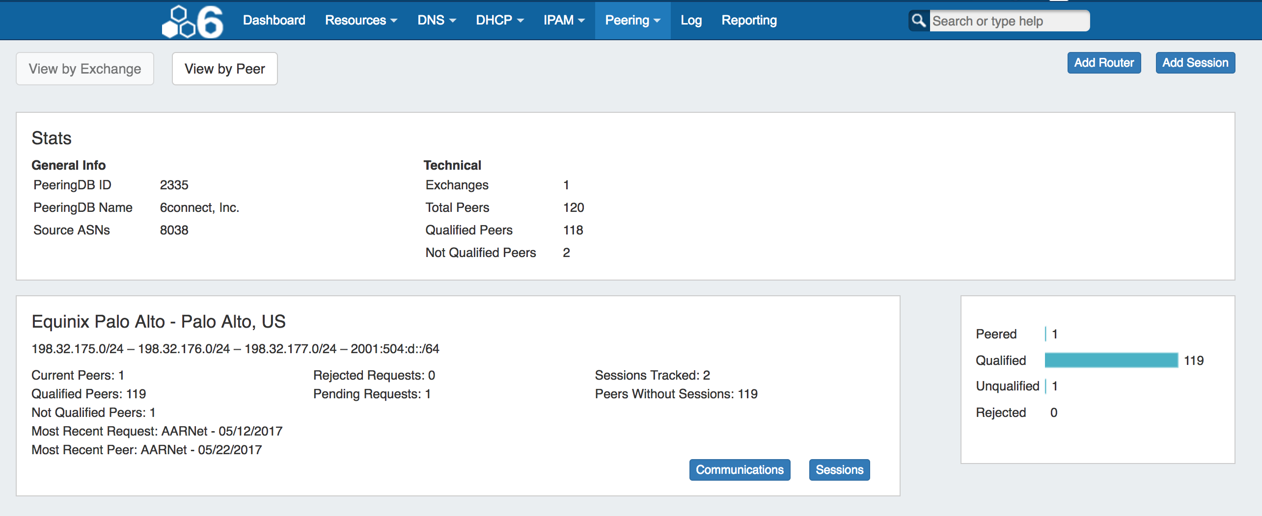 The Peering tab displays peering stats, allows you to add routers and sessions, and manage communications and sessions for each exchange.