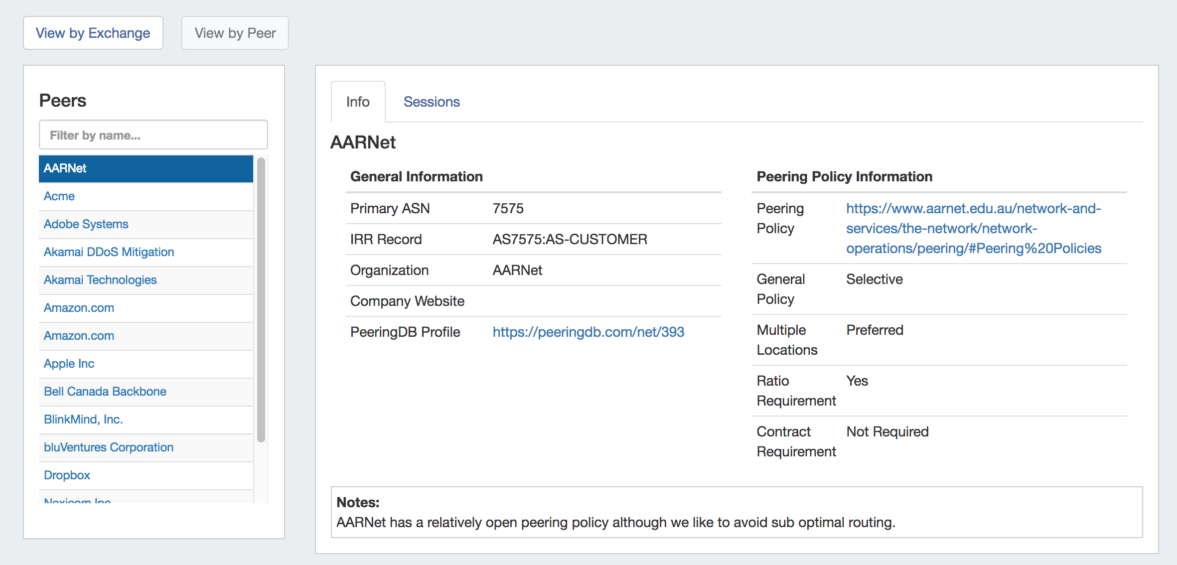 Selecting a Peer from the list at the left shows the PeeringDB information available for that Peer, including profile and policy links.