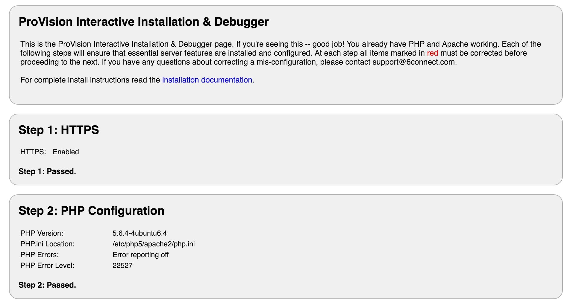 IM - 2167: install/configTest.php has been updated to provided a smoother install or upgrade experience. The installer now provides clear step-by-step checks for required dependencies and settings. At each step, all items marked in red must be corrected before proceeding to the next. If you have any questions or require assistance correcting a mis-configuration, please contact support@6connect.com.
