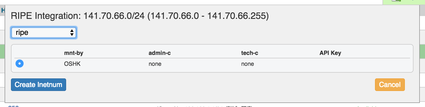 Identify which LIR data you want to use for the netnum update, and select either "Create Inetnum" or "Cancel" to exit.