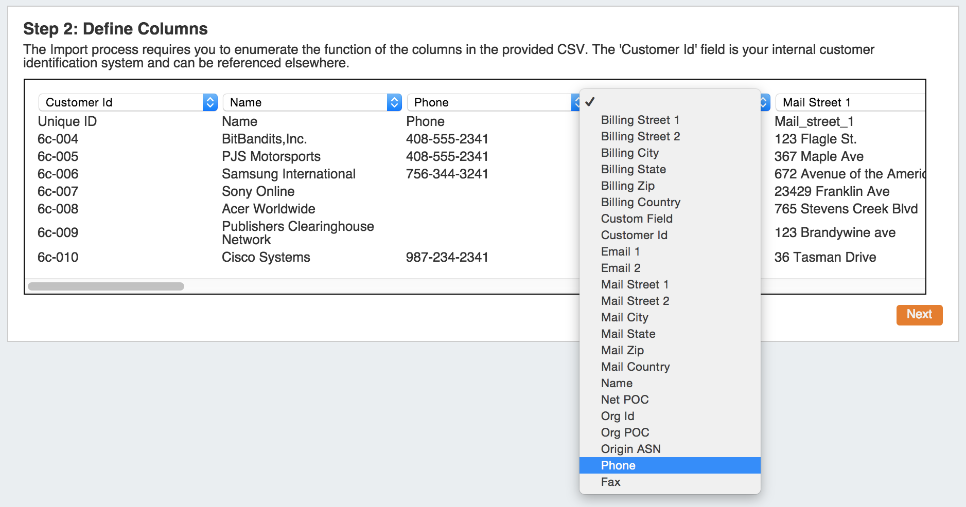 Using the dropdown menu above each data field, select the appropriate definition for each of the imported columns. Phone and Fax may have multiple columns associated with the data. Other columns which do not apply under the available definitions should be left as blank, and will be skipped during the upload process.