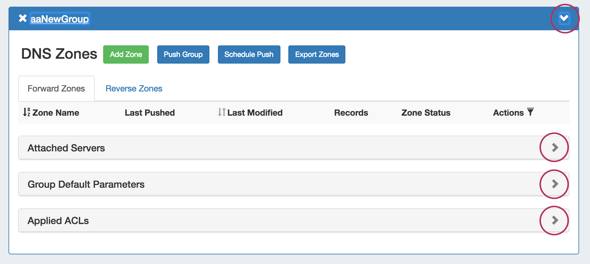 All zones under a DNS Group may be exported to a .zip file by clicking the "Export Zones" button at the top of the Group module.