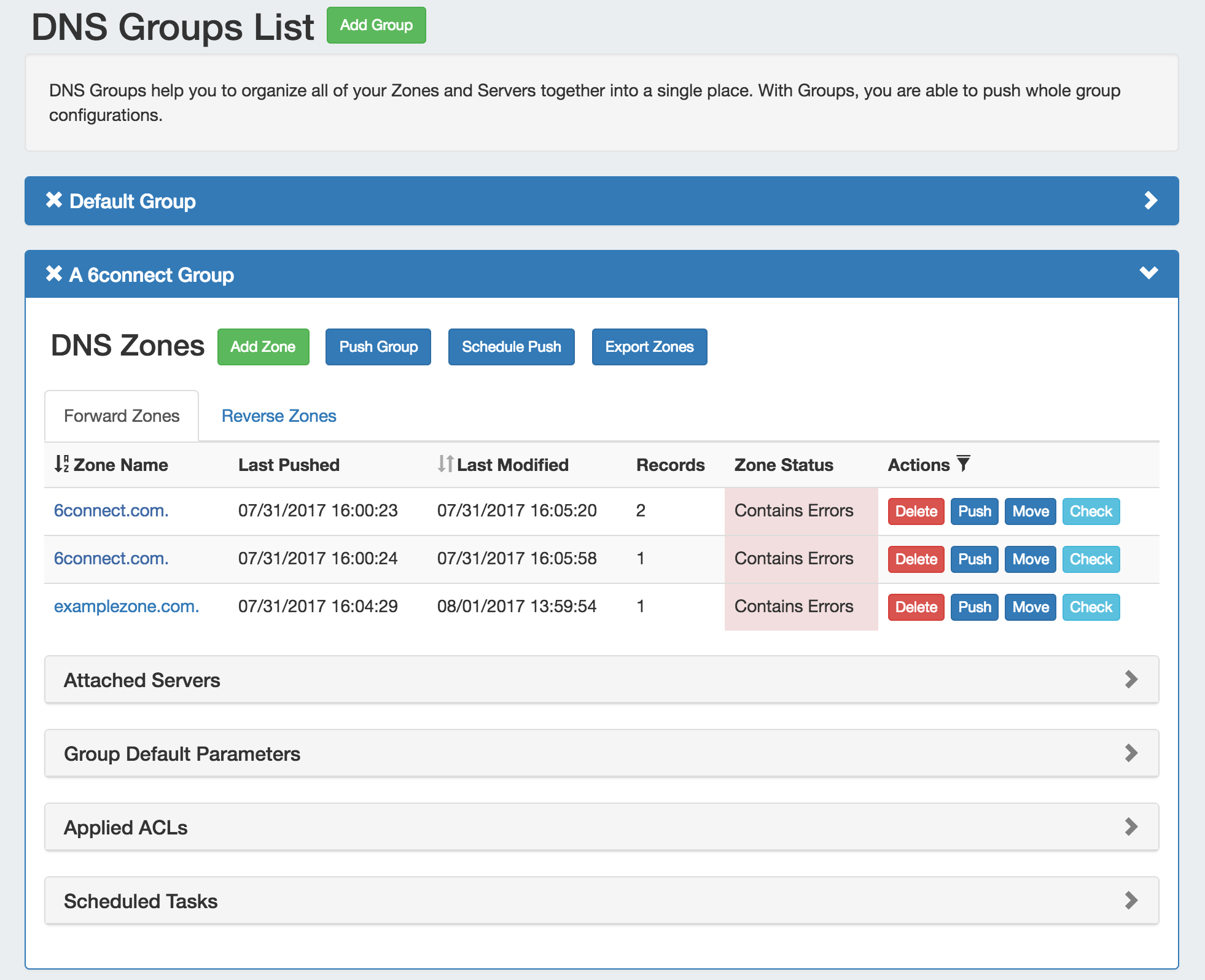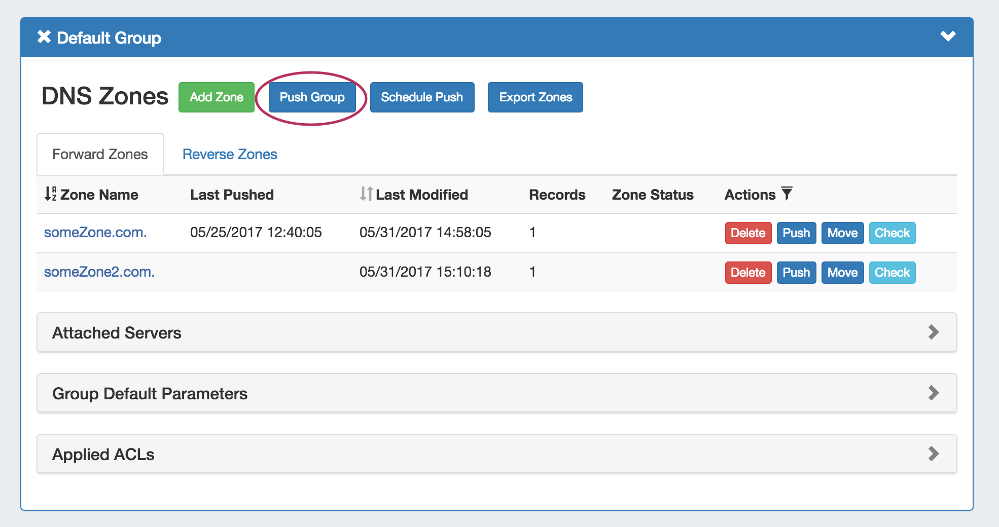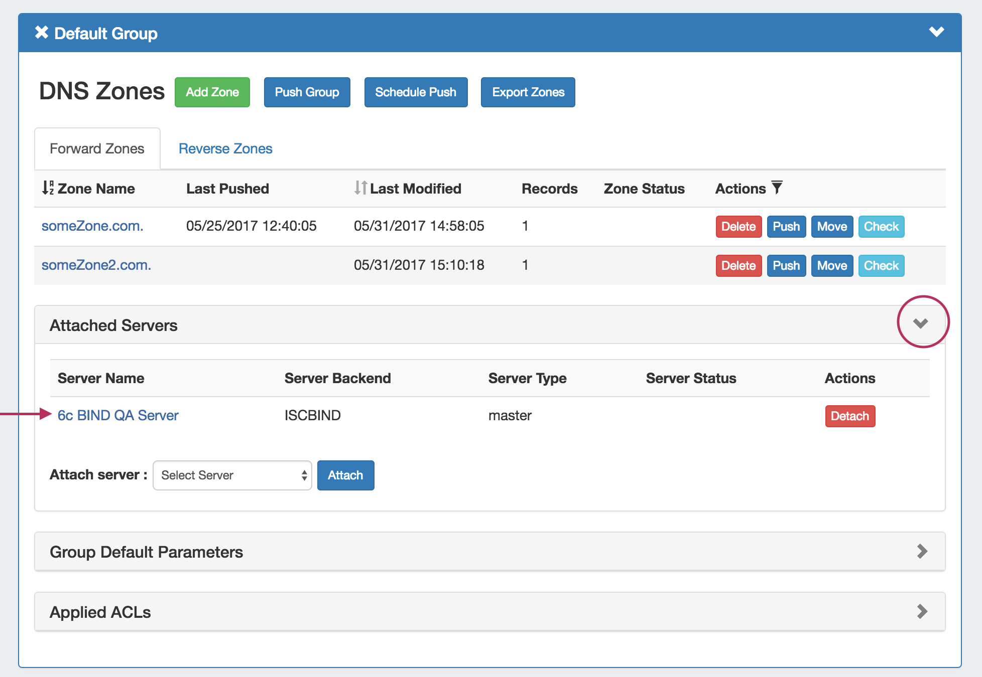 Before pushing a group, expand the "Attached Servers" section and verify that the correct server is attached to the DNS Group.
