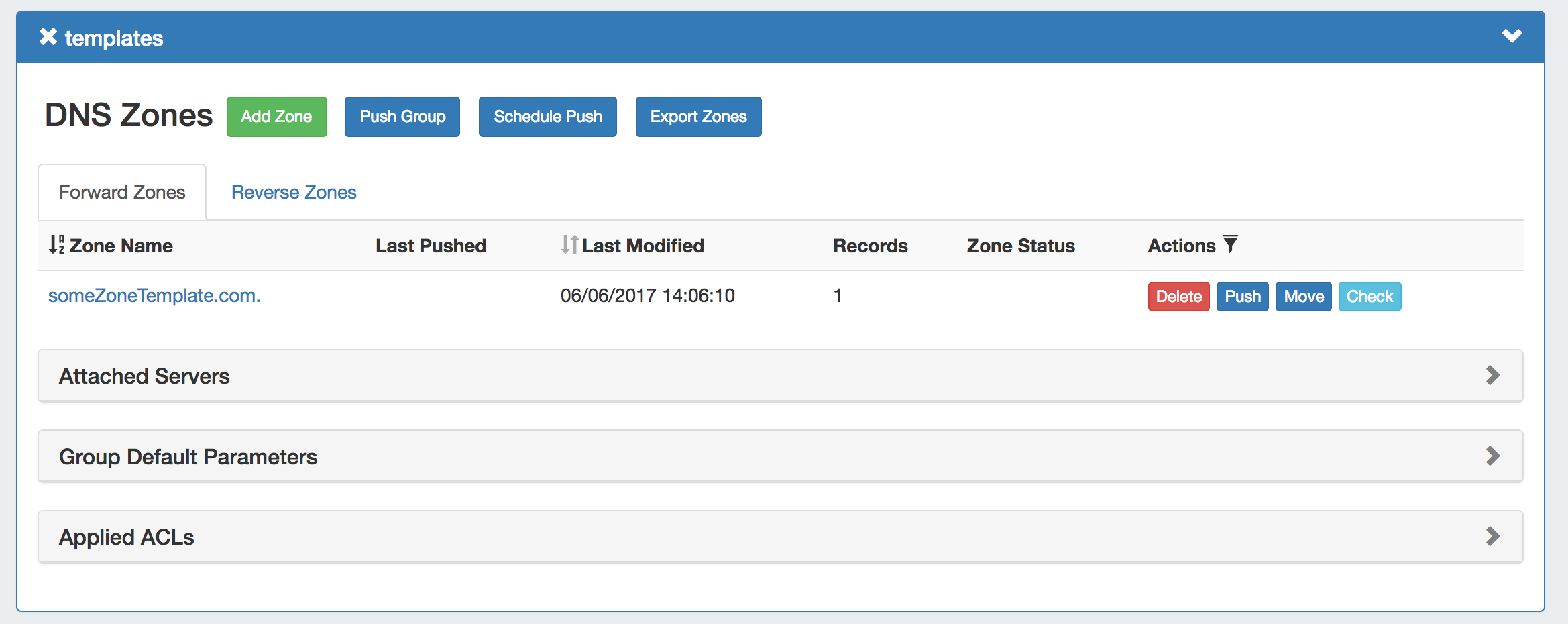By default, a "templates" group is included in DNSv3. Any pre-DNSv3 DNS Templates will be included in this group, as well as any newly created zones to be used as template zones.