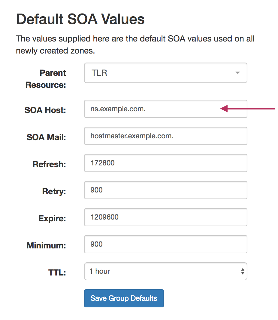 To edit the Default SOA values, simply click inside the value to be changed and type or select your new value. Be sure to also verify the desired Parent Resource for the Group, as the resource selected determines the Group's permissions.