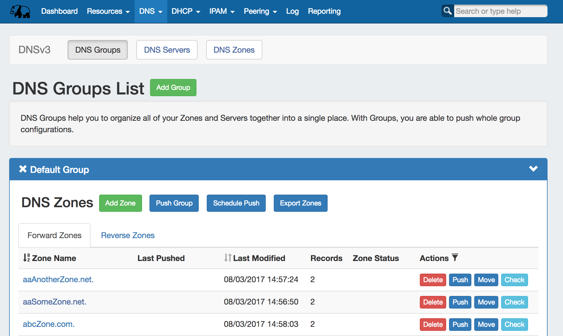 The DNS tab Groups List allows you to create, view, and manage groups of DNS Servers and Zones. Using groups, you can configure and push selected combinations of zones at one time.