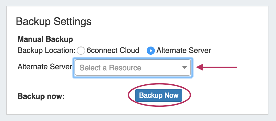 Select "Alternate Server" as your backup location, then select the desired ProVision server Resource. After selecting your server, click on the "Backup Now" Button.