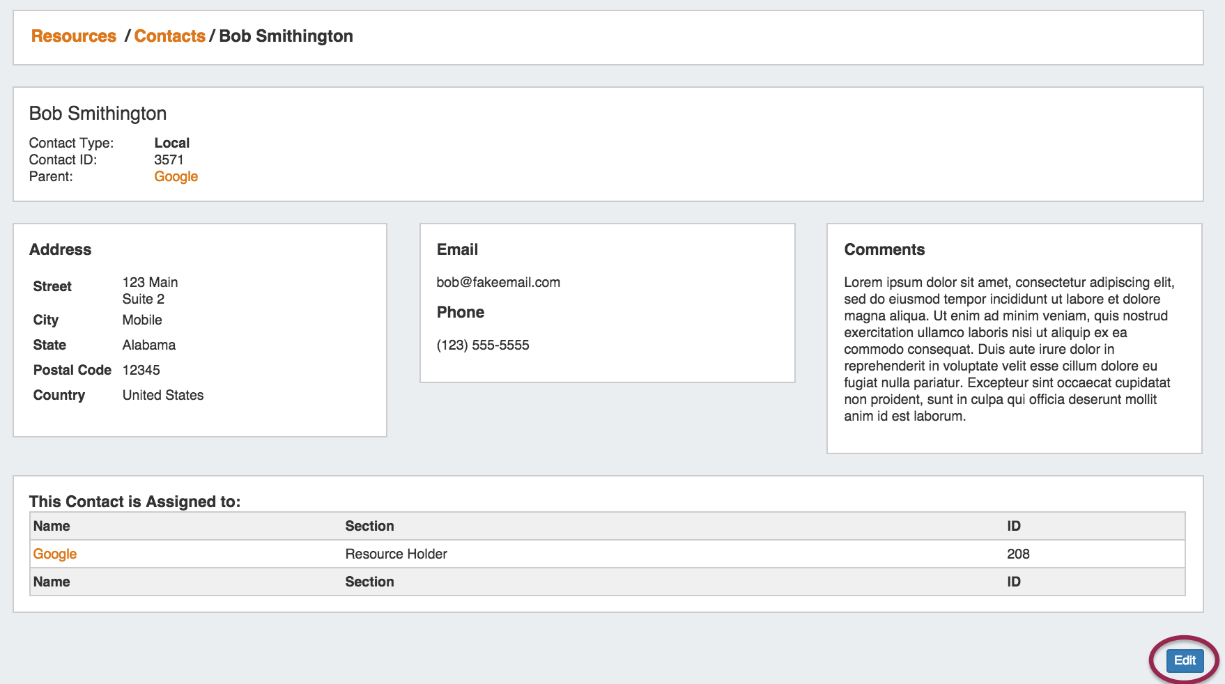 Fill in the contact's information for Name, Parent Resource (if desired), Phone, Custom ID, Email, Address, and Comments if desired.