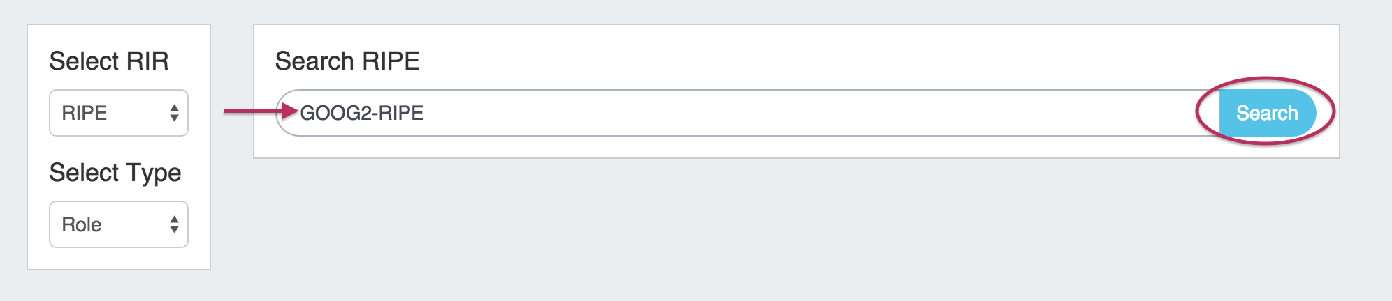 After selecting the RIR / Type (if applicable), enter the ARIN or RIPE Point of Contact Handle for the contact you are importing, then click "Search".