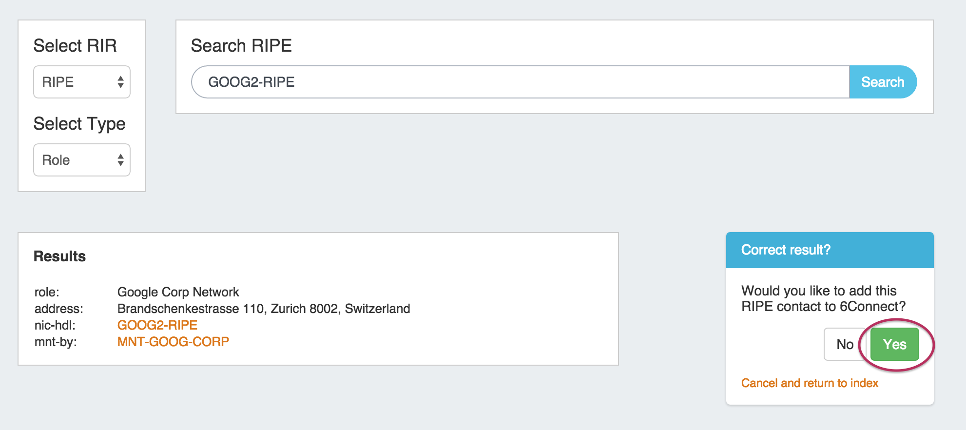 If the search is successful, the found contact information will display at the bottom of the screen. If this is the information you wish to add into ProVision, click the "Yes" button on the right hand side of the page under "Would you like to add this RIPE contact?". Otherwise, you may hit "No" to decline adding, or cancel and return to the index.