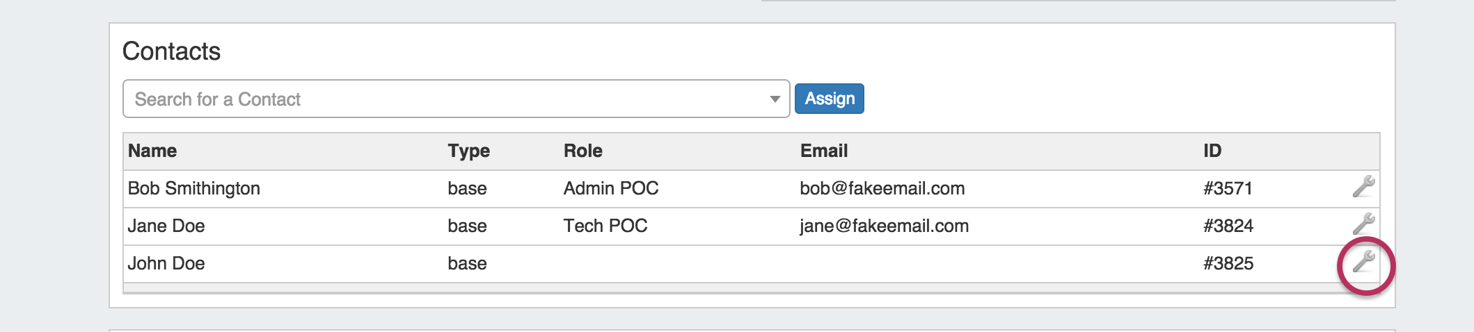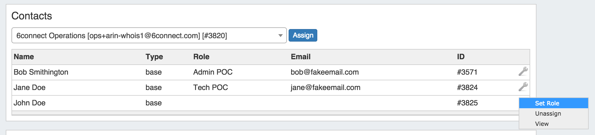 Once a contact has been assigned, you can create and set a role for the contact by clicking on the Action Menu (wrench icon).