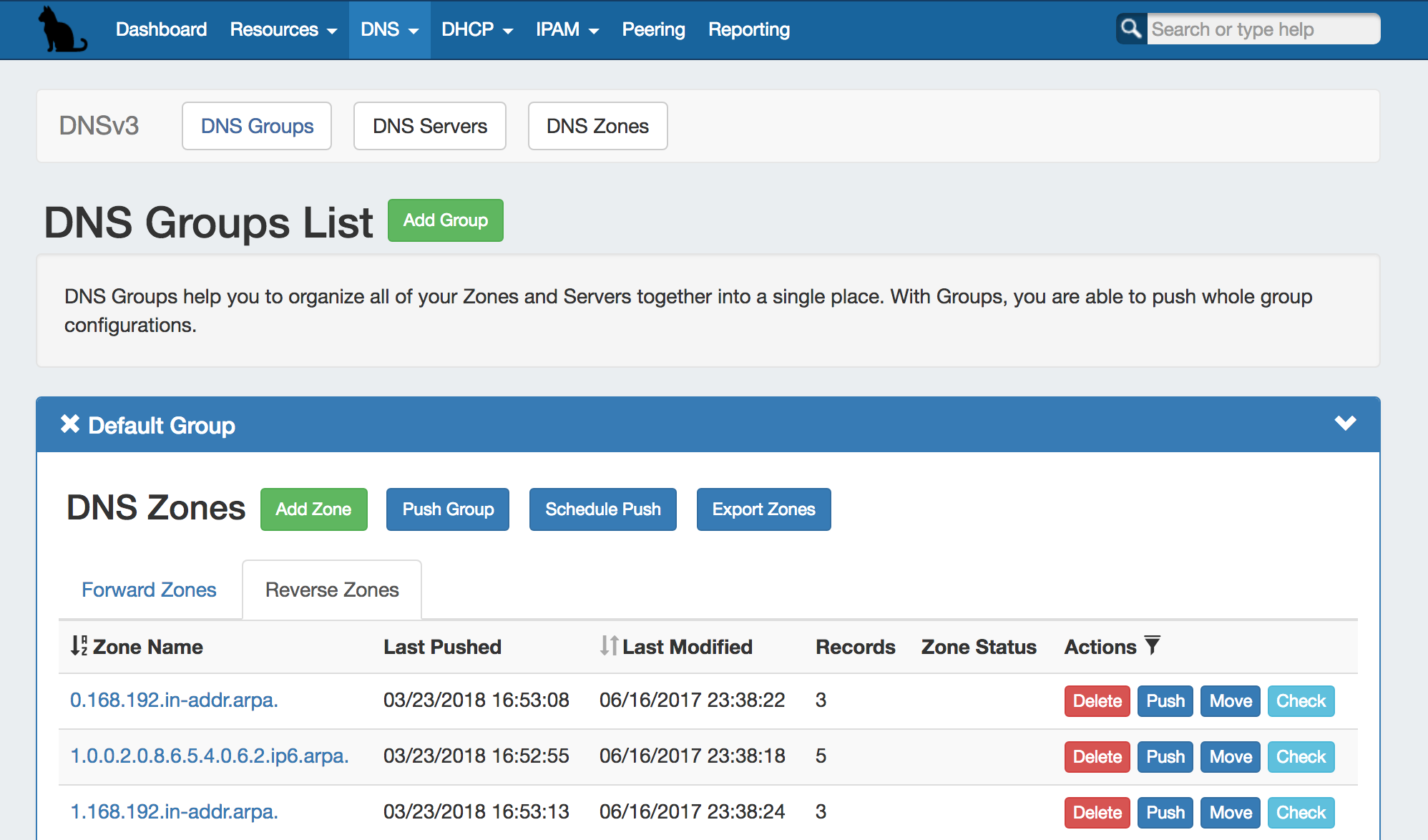 In DNSv3, zones are gathered under DNS Groups, servers are attached to those Groups, and Nameservers, Default SOA values, and ACLs are managed at a per-Group level. Users can then view and manage Groups, individual zones, default SOA values, ACLs, attach servers, and perform pushes all on the same page.