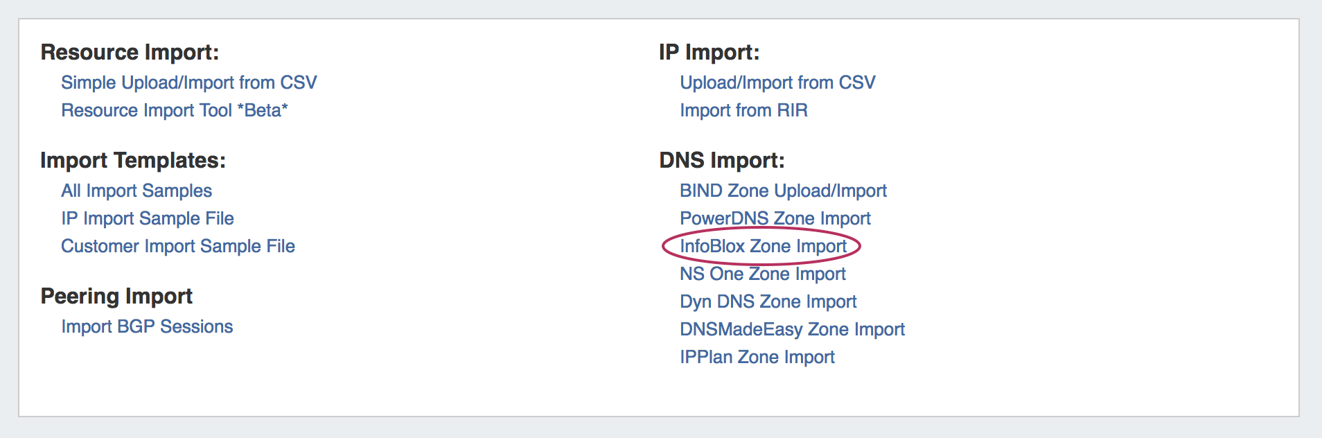 Once server setup has been verified, navigate to the Data Import Tab in the Admin section. Select the "InfoBlox Zone Import" link.
