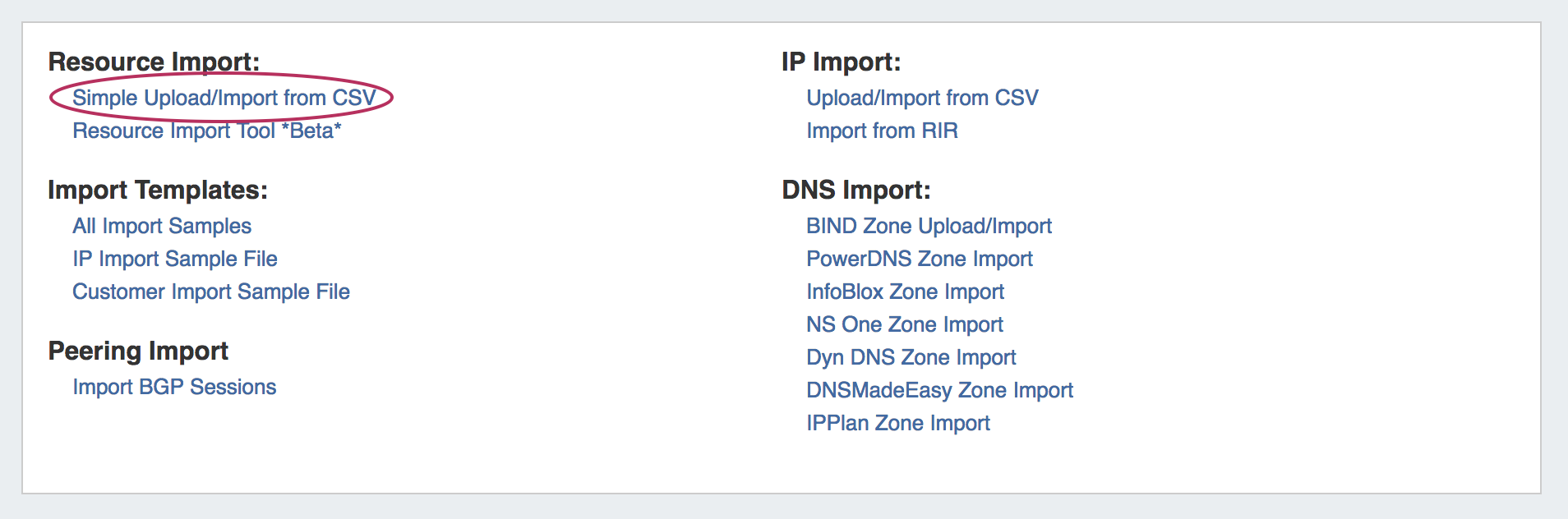 Navigate to the Data Import Tab from the Admin button. Select "Simple Upload / Import from CSV" under "Resource Import".