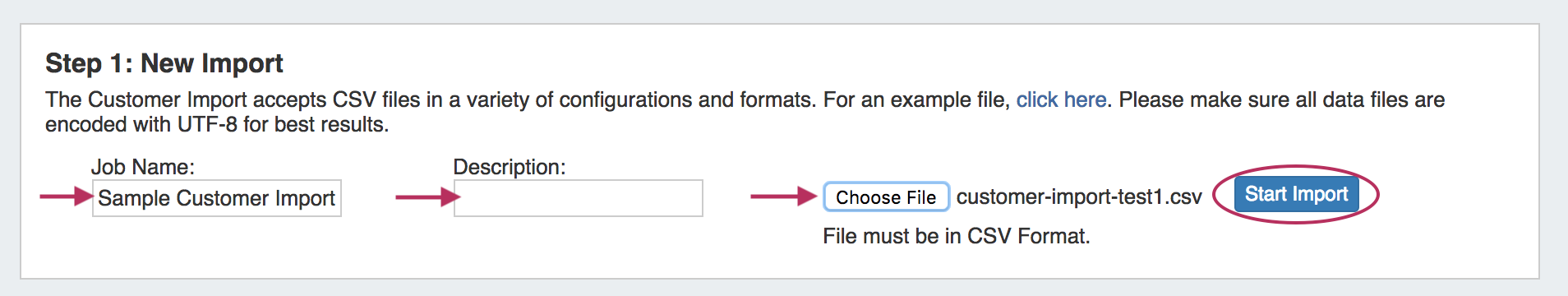 Select the .csv file that you prepared above by selecting the "Choose File" button, and browsing to the correct file location. Then hit "Start Import".