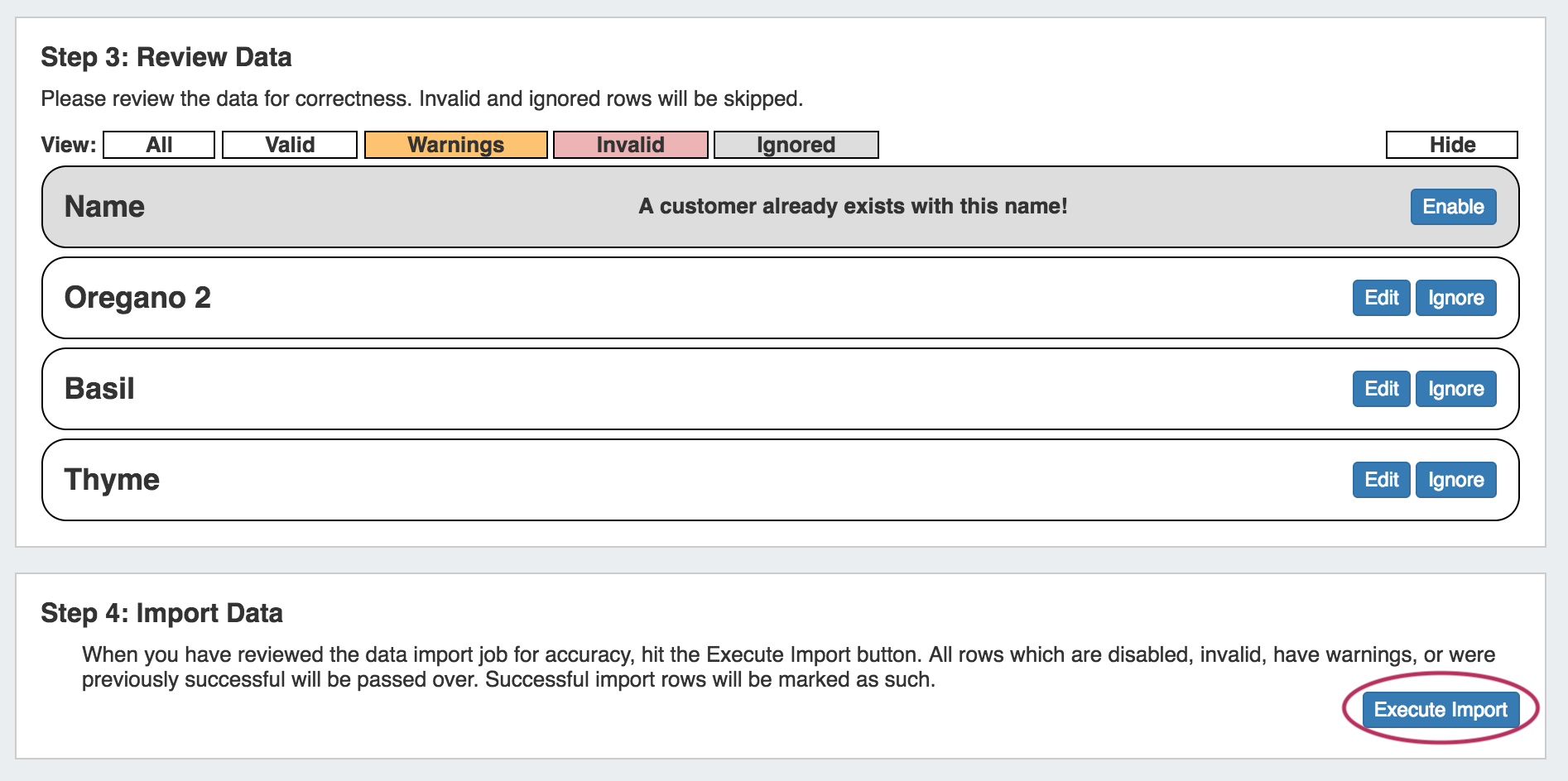 From here, the records can be edited or ignored. Select "Ignore" for records that you do not wish to import at this time. Records that are Ignored or Invalid will automatically be skipped.