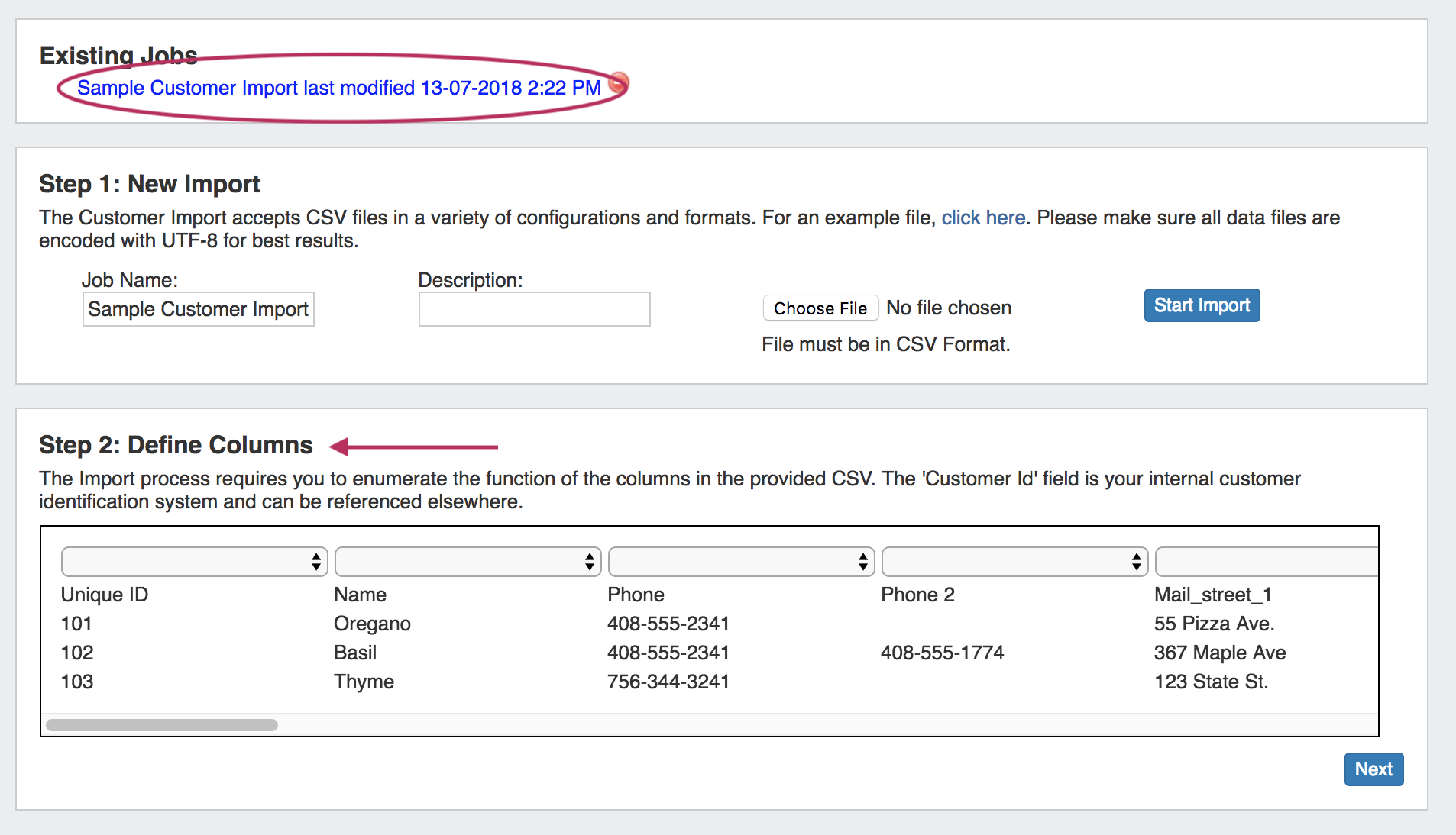 To continue working with this job, select it from the list (by clicking on the link) and the next step ("Define Columns") will appear at the bottom of the page.