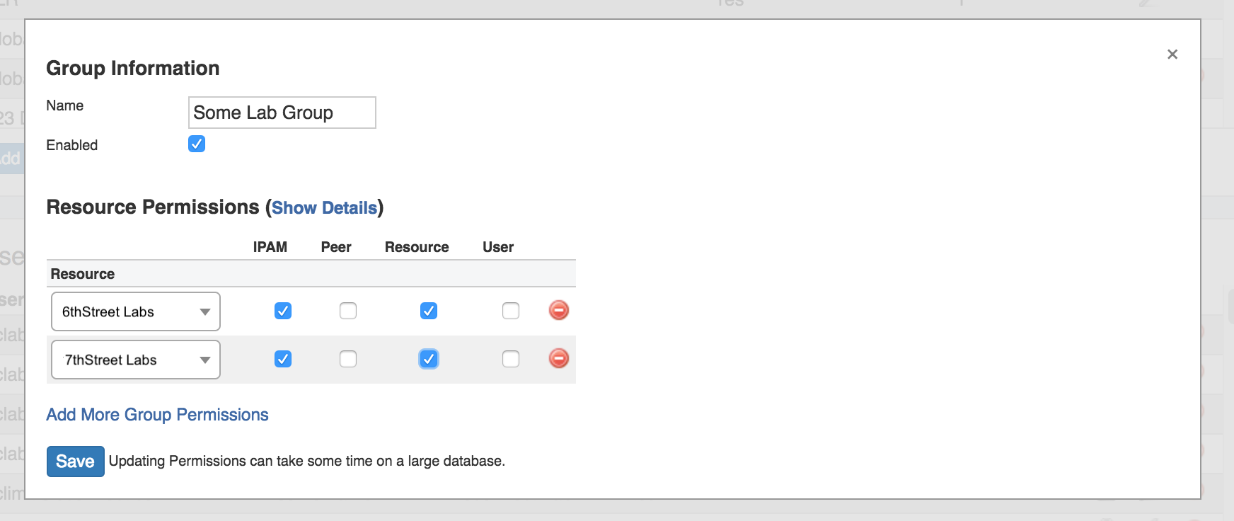 Additional Resources may be added to the list by clicking on "Add more Group Permissions".