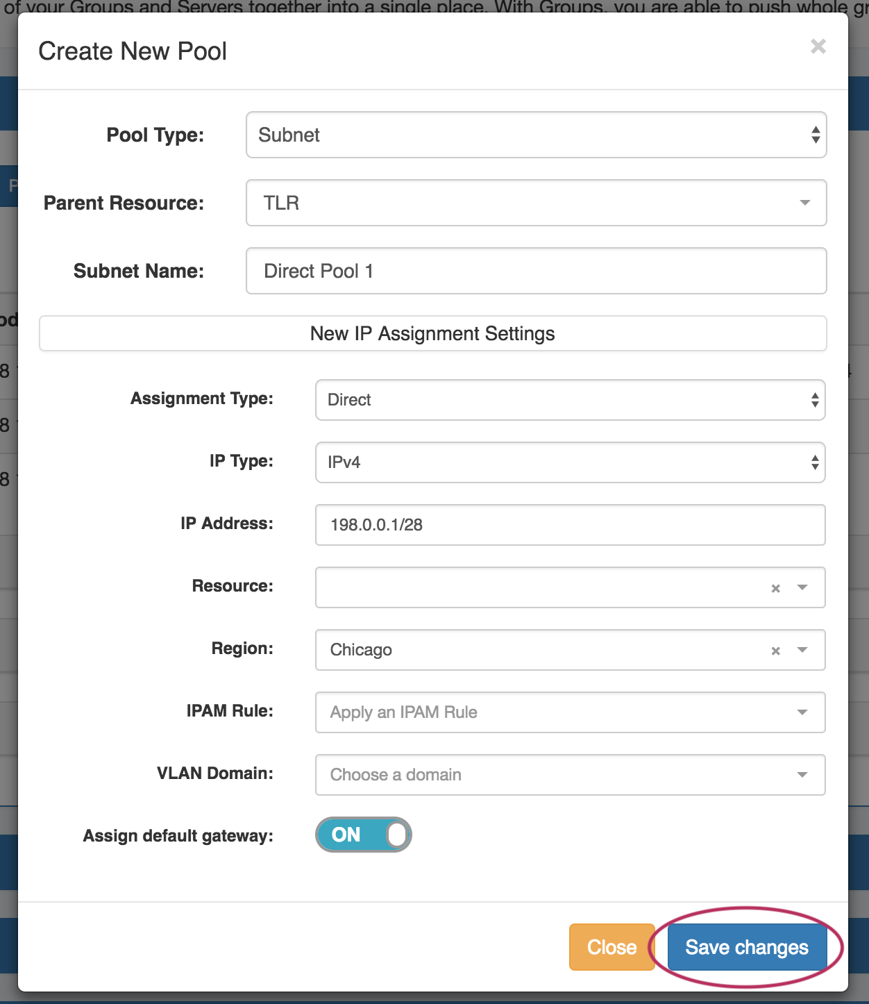 All other fields are optional - Resource, Region, IPAM Rules, and VLAN may be selected to further narrow the block criteria. If desired, toggle "Assign Default Gateway" on.