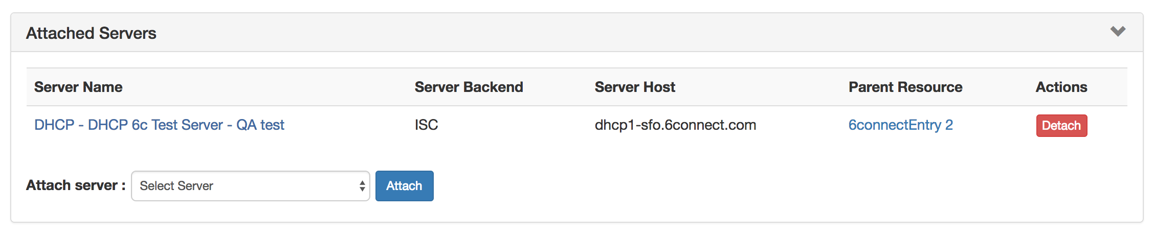 16) Attached Servers: Click on the header title or > to expand or collapse. View, attach, or detach a DHCP server from the group.