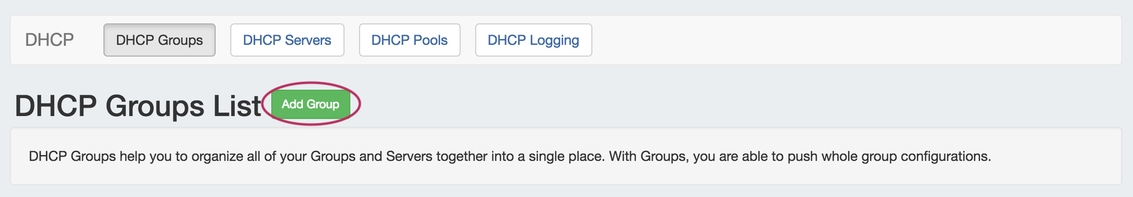 Create DHCP Groups by clicking the "Add Group" Button, then add subnet or host pools under the group by clicking "Add Pool" for the desired Group.