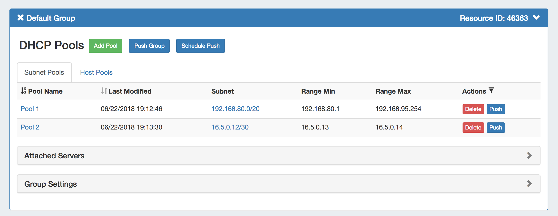 Pools may be pushed individually, as a part of a DHCP Group, or through pushing an entire DHCP Server.