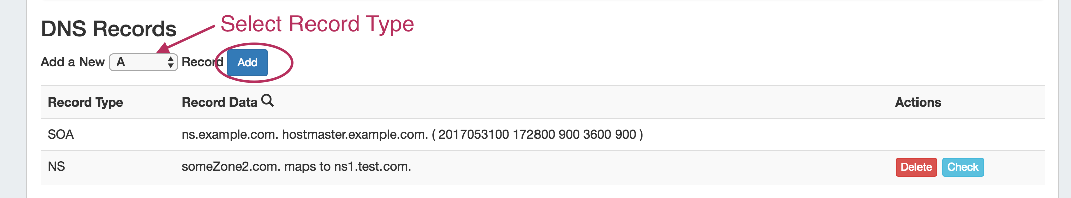 From the View Zone page, under DNS Records, look for the line "Add a new ___ Record". Select the desired record type, then click "Add".