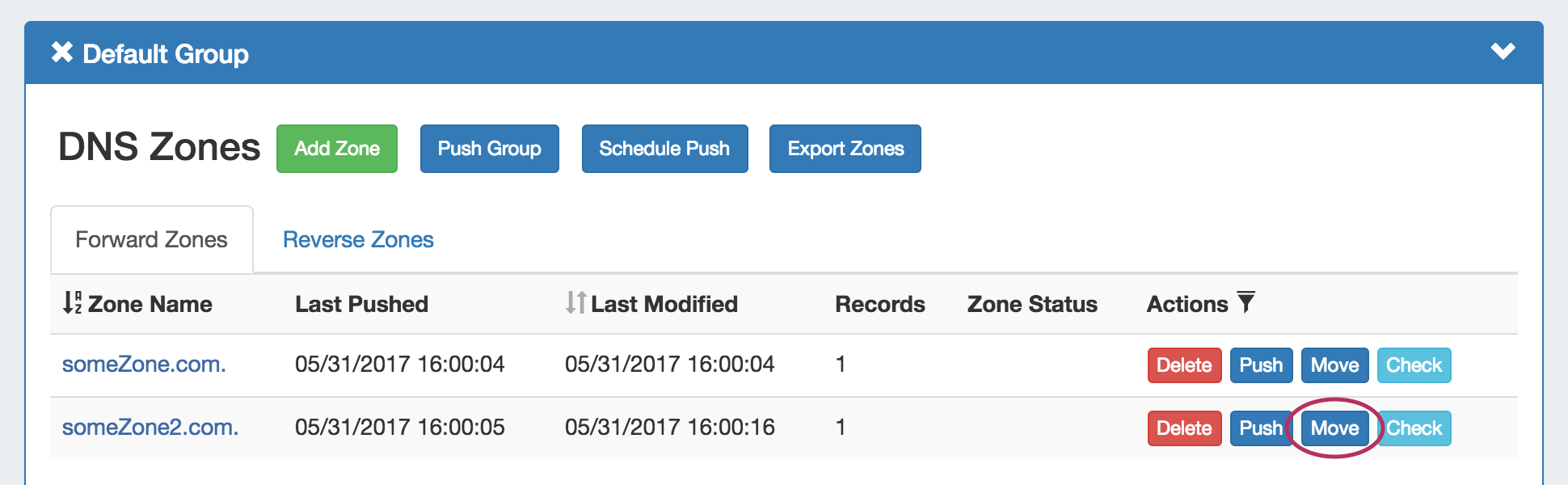 Zones may be moved to a different Group than the one created under, by clicking the "Move" button in the zone's Actions menu.