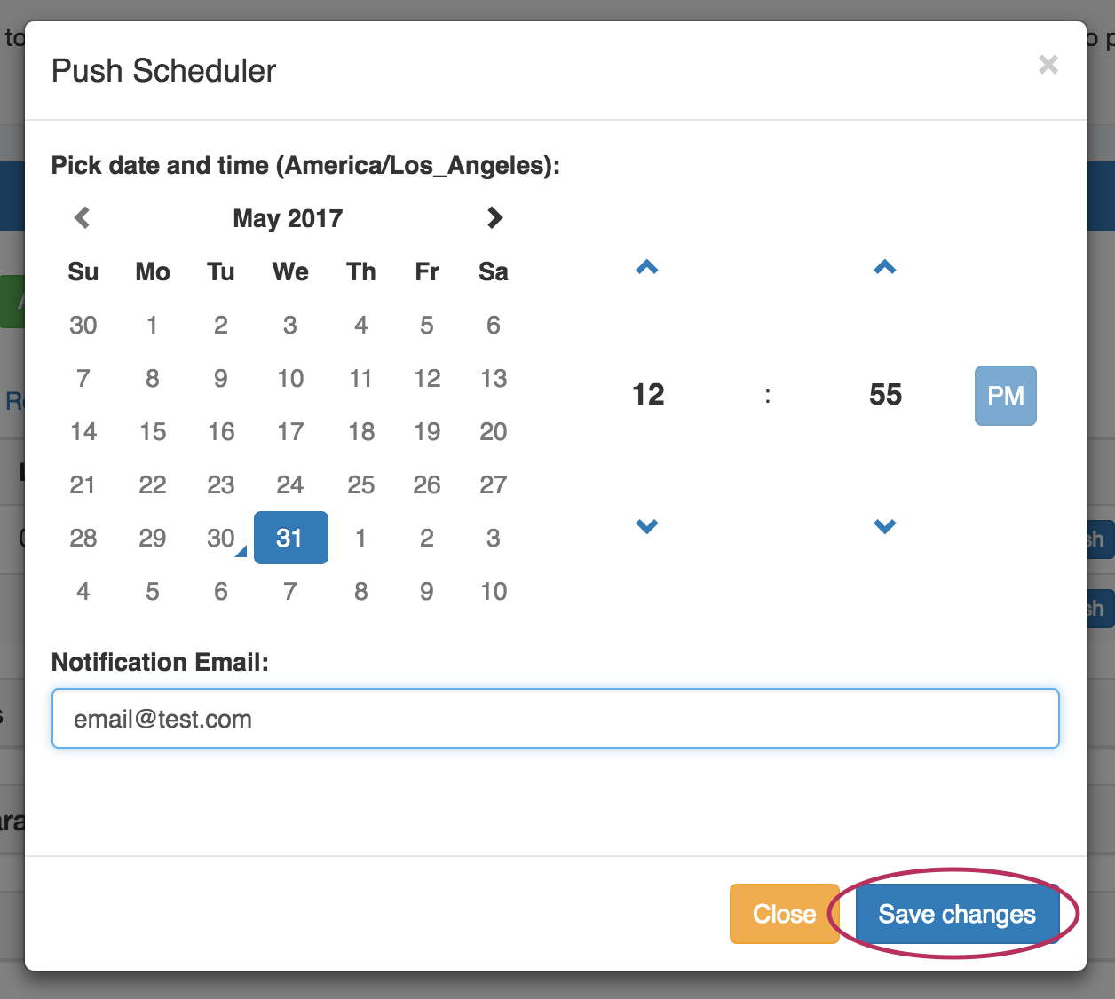 Click "Schedule Push" for the zone, then select a date, time (12 hour, with AM / PM toggle), add a notification email address, and click "Save changes".