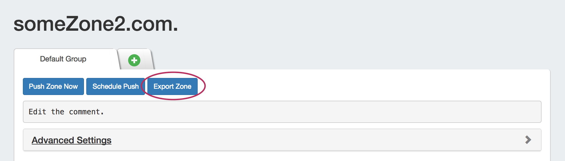 Individual zones may be exported to a .zone file by clicking the "Export Zone" button on the View Zone page.