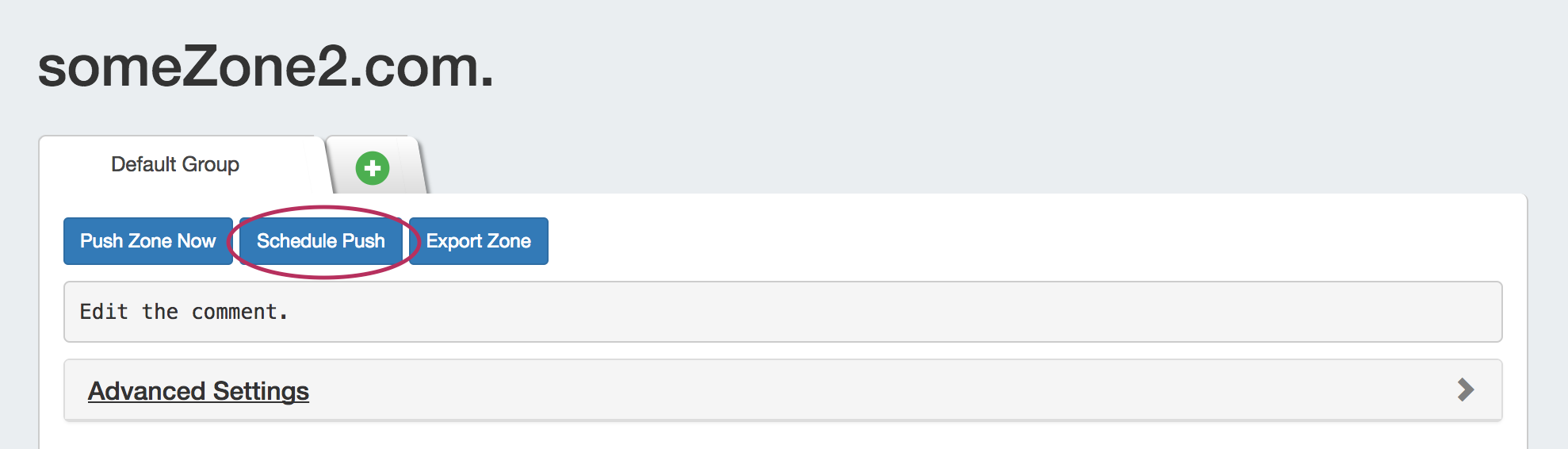 To immediately push a single zone, navigate to the DNS Group the zone is under, then click the "Push" button in the Actions column for the zone. You may also look for the zone in the  DNS Zones tab Zone List, and then likewise, click the "Push" button in the zone row.