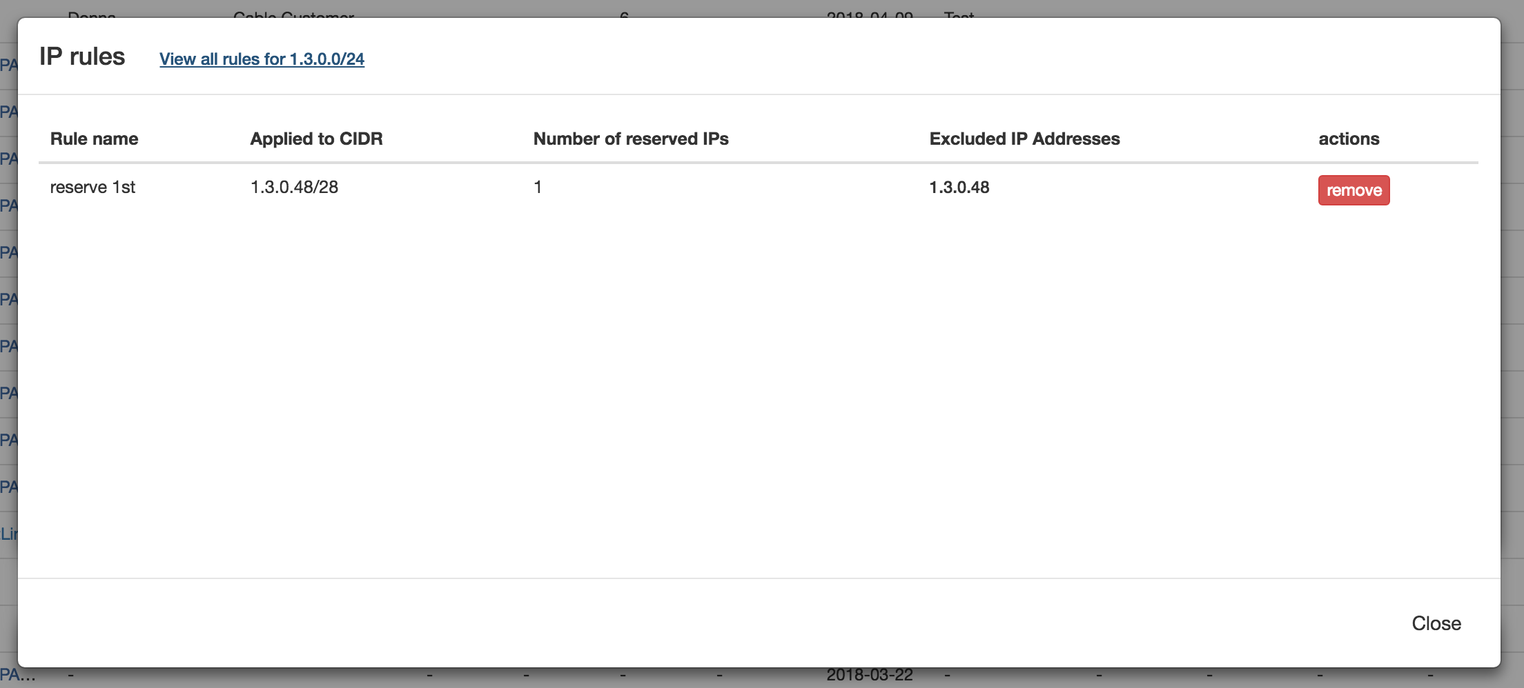 Once changes are applied, the rule will show the name, affected CIDR, affected IPs, and present with an option to remove the rule.