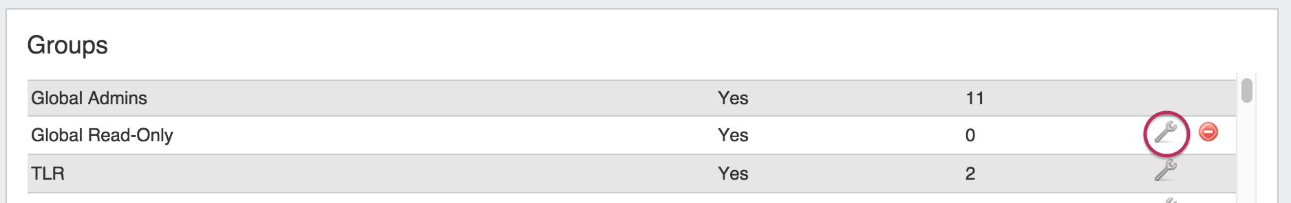 Global groups may also be edited just like standard groups, through selecting the Action Menu (Wrench Icon) to bring up the group information details. Groups may be deleted by selecting the red circle icon.