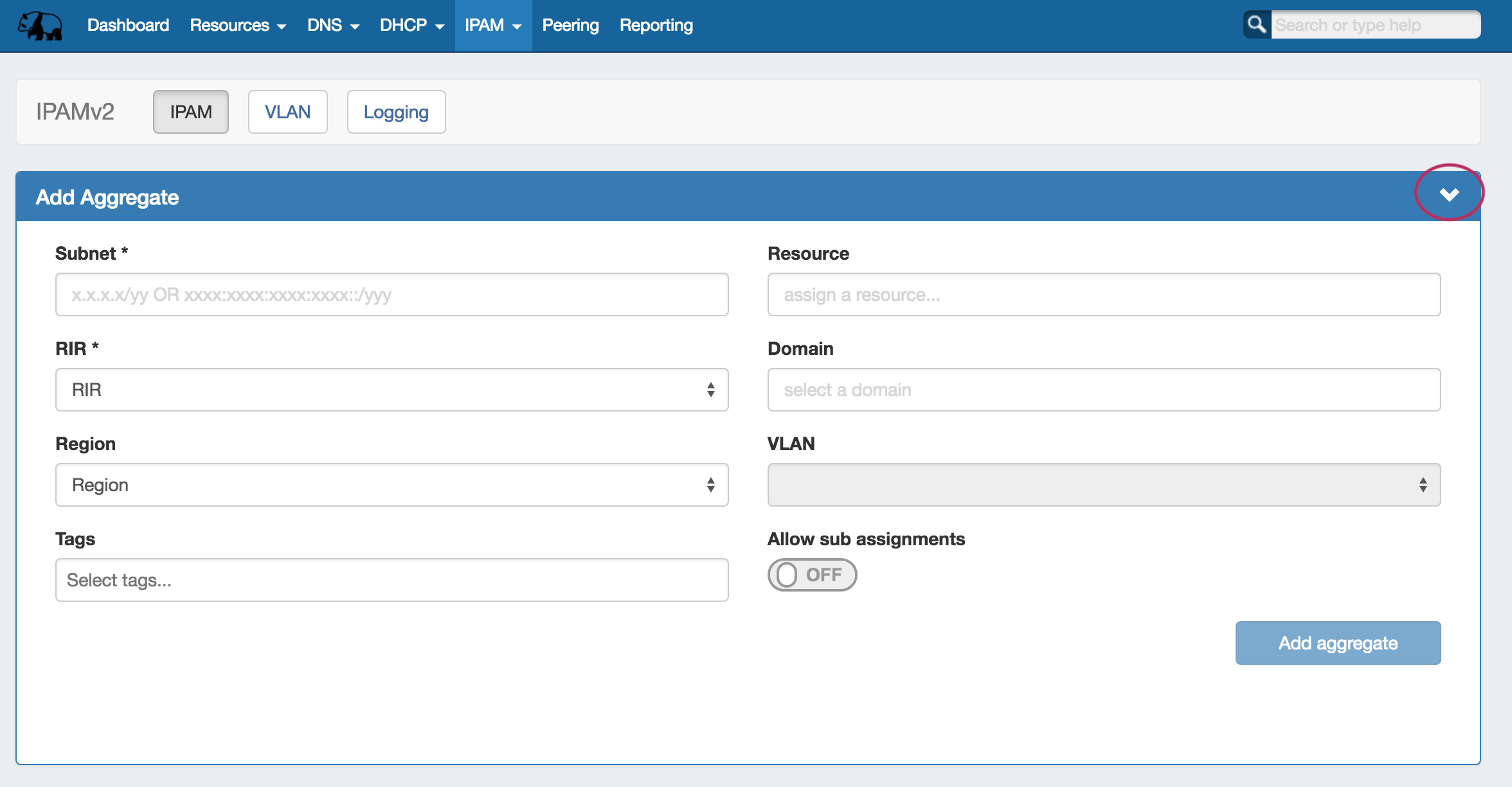 Opens a menu to add an aggregate block with options for RIR, VLAN, Tags, Region, Resource, and enabling Sub-Assignments.