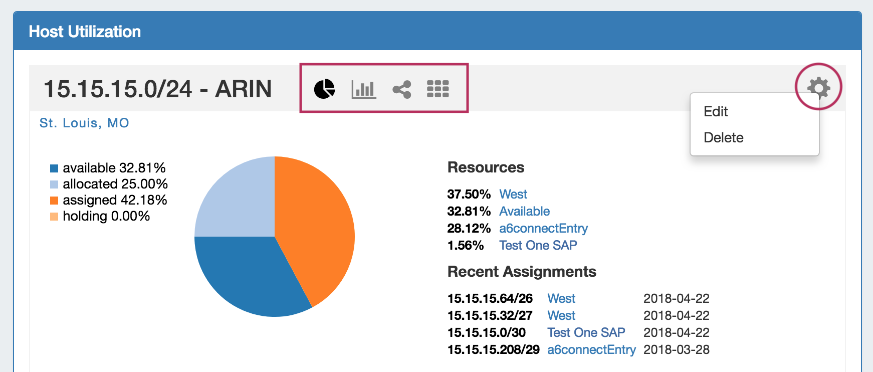 Provides utilization data and a shortcut link to the IPAM Manage screen for that aggregate if in "Aggregates" view, or assignment details if in "Recent Assignments" view.