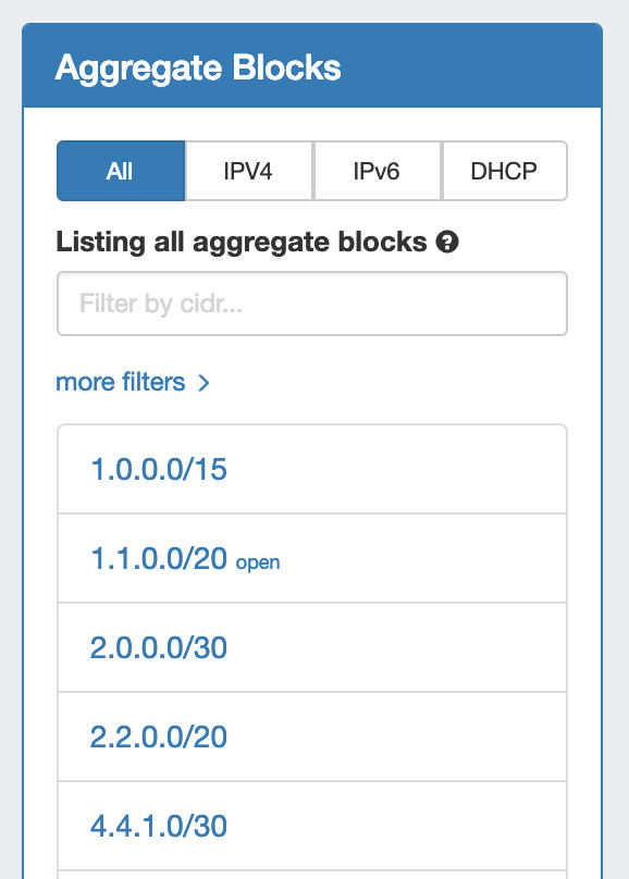 Provides a searchable / filterable listing of all aggregate blocks in the left sidebar, links IPAM Manage for the aggregates, and Merge Aggregate functionality.
