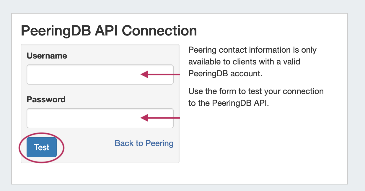 If no account is set, or the current account is invalid, follow the link to the Peering Admin Settings page to test and add a PeeringDB account.