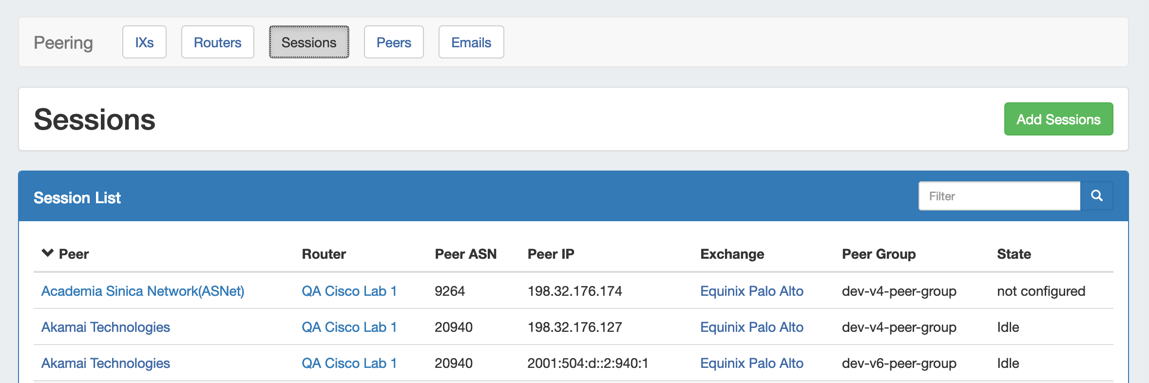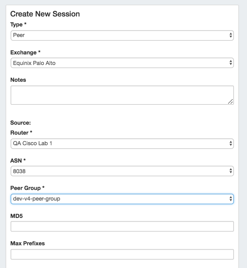 Then, add in the session details: at minimum, the type, exchange, router, ASN, Peer Group, and Destination.