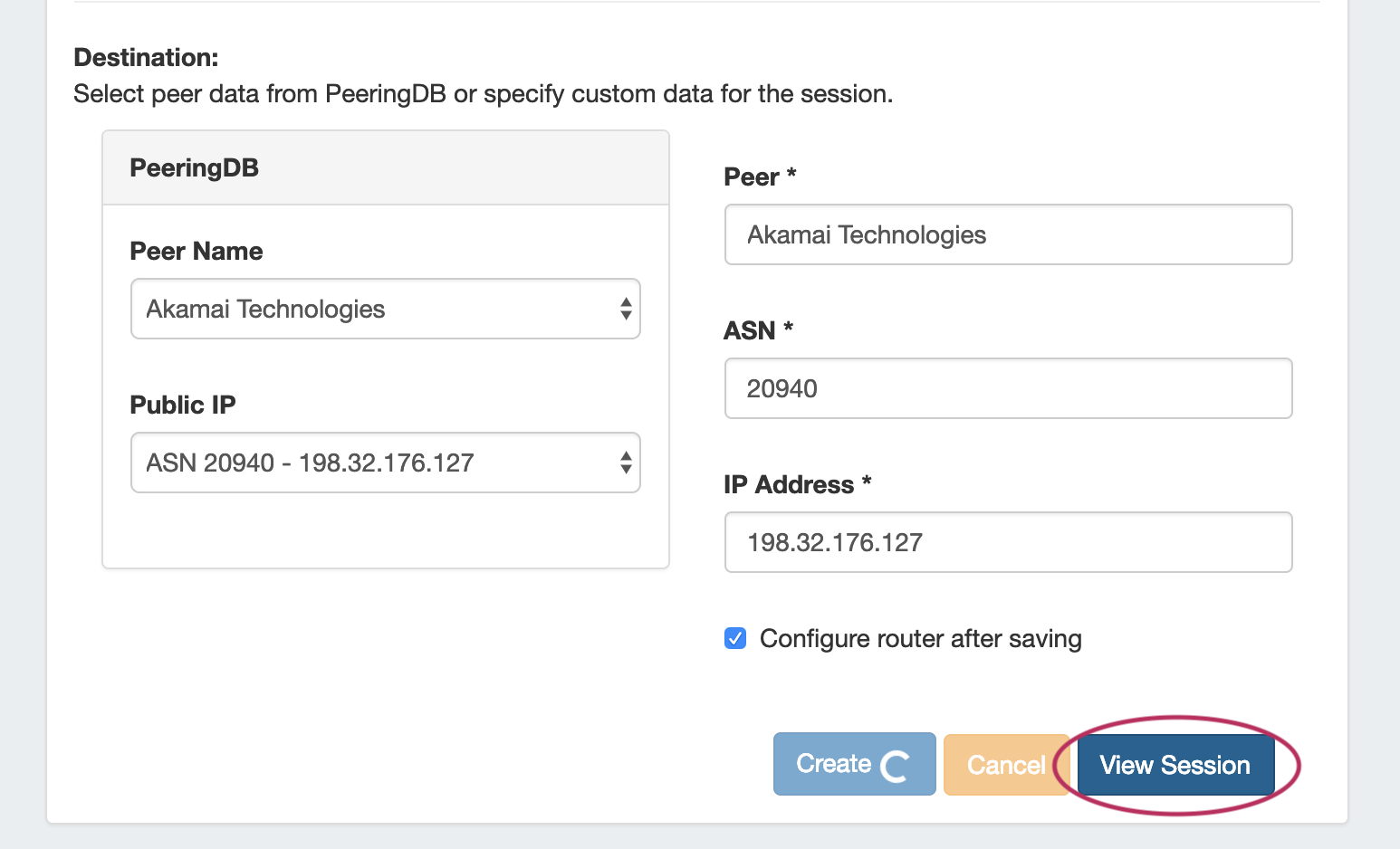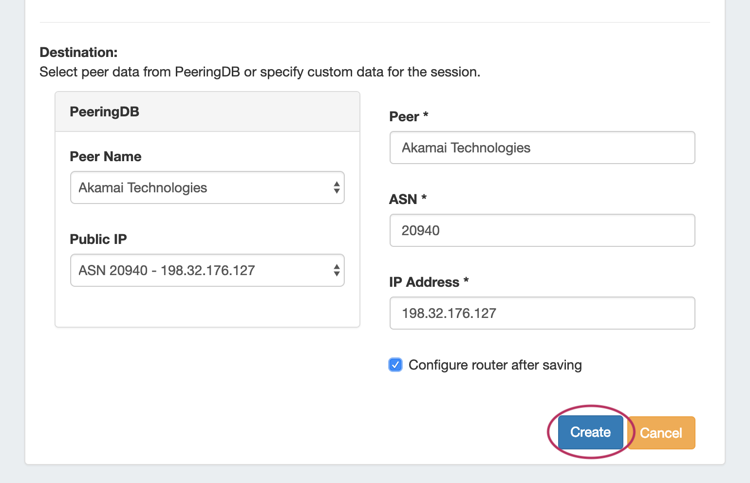 After selecting the Peer Destination information, you have the option of configuring the router immediately after saving.