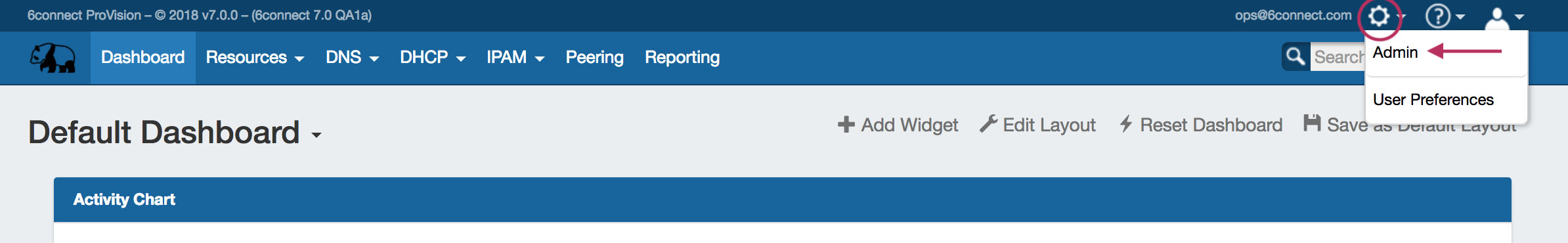 To access the Admin area, click the gear icon at the top right section of the header from any page.