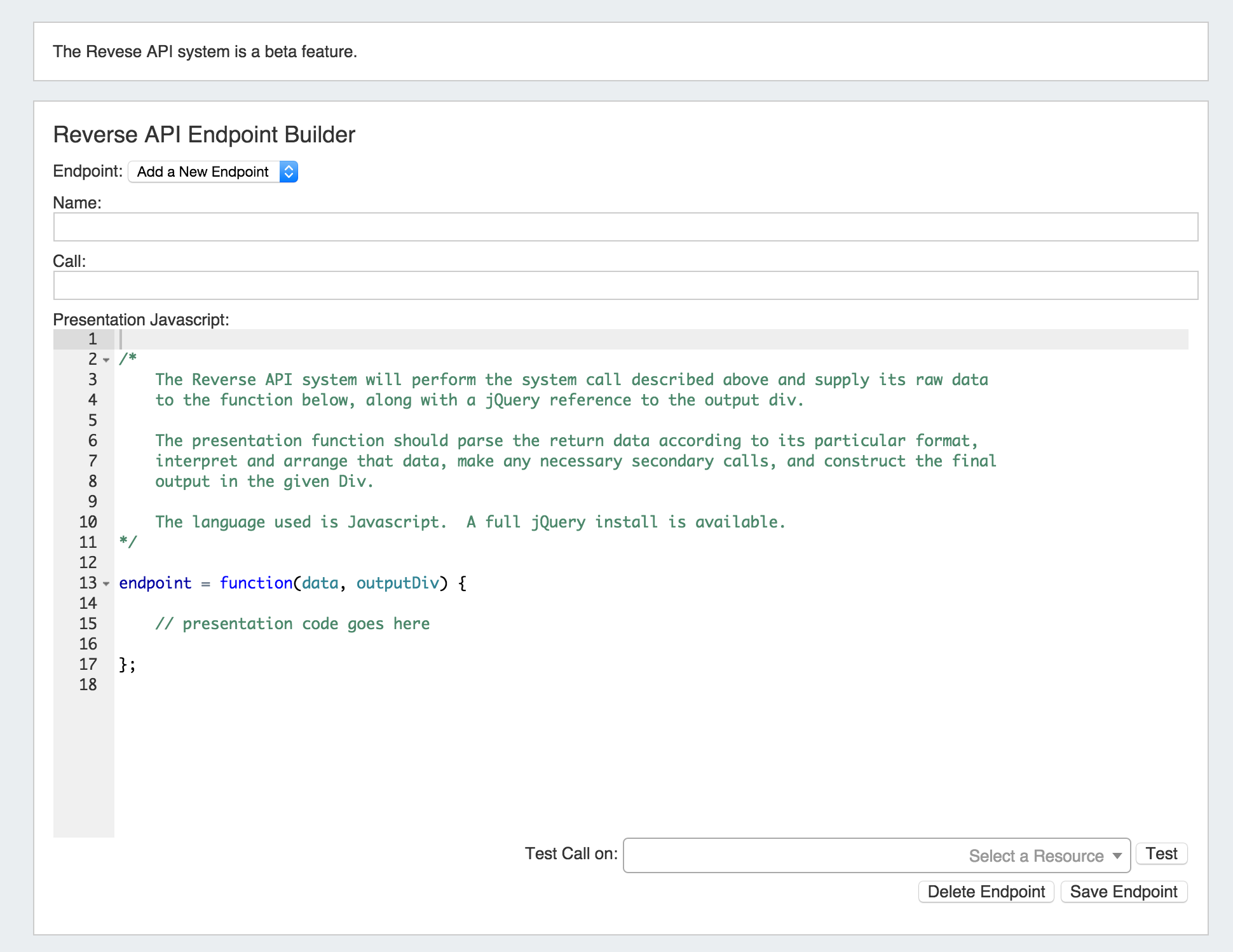 The created Reverse API endpoint may be added to the Reverse API Console Gadget, and shown on a Resource's Entry Page.