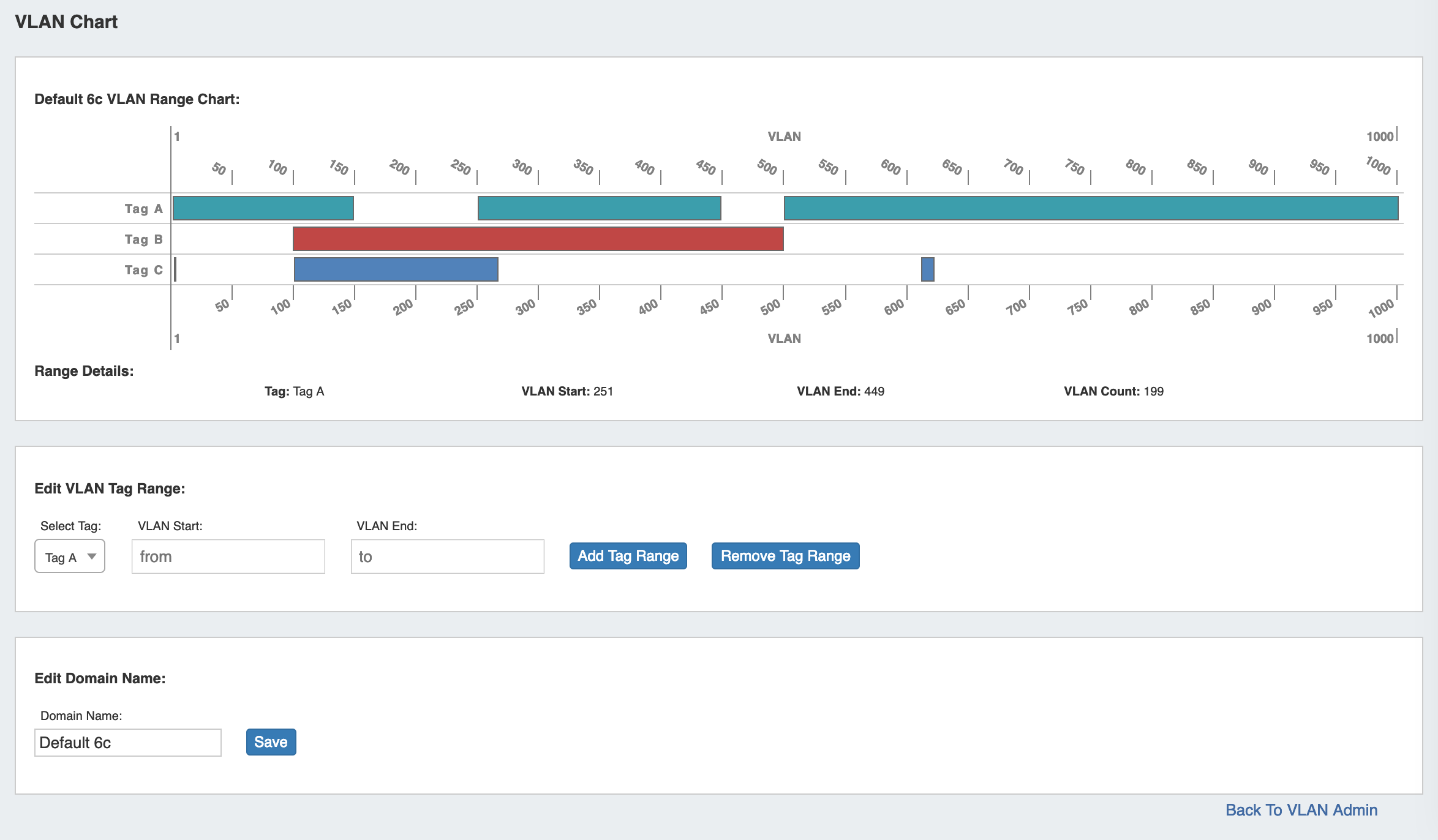 Here, VLAN tags associated with VLANs in this domain will display in the VLAN chart. To see the details of each tag range, hover over a segment with the mouse cursor, and details will display at the bottom of the chart. Add or remove tag ranges from the "Edit VLAN Tag Range" area below the chart - just select the tag, the desired range, and choose whether to add or remove that tag range to or from the chart.