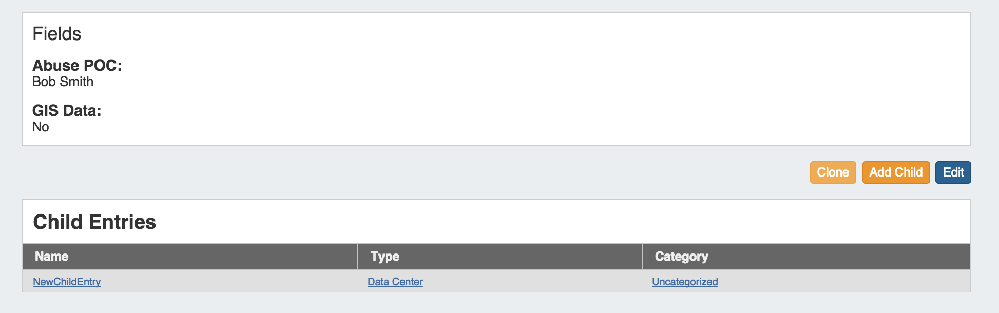 This feature can be used to quickly and efficiently create multiple resources with same format, field information, or similar hierarchy structure. One example may be a datacenter with x number racks with y number of servers on each. One rack, with its servers as child entries could be created, and then cloned until the necessary quantity is reached. As text field information is copied during the clone, changes in individual server information would still need reviewed and updated. Think of cloning as creating a template from an existing Resource Entry.