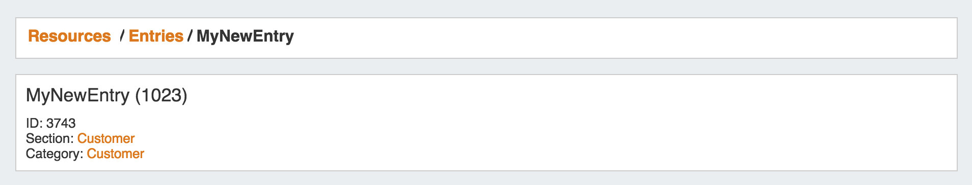 The Resource Entry page displays basic details about the Resource, including name, id, section, and category.