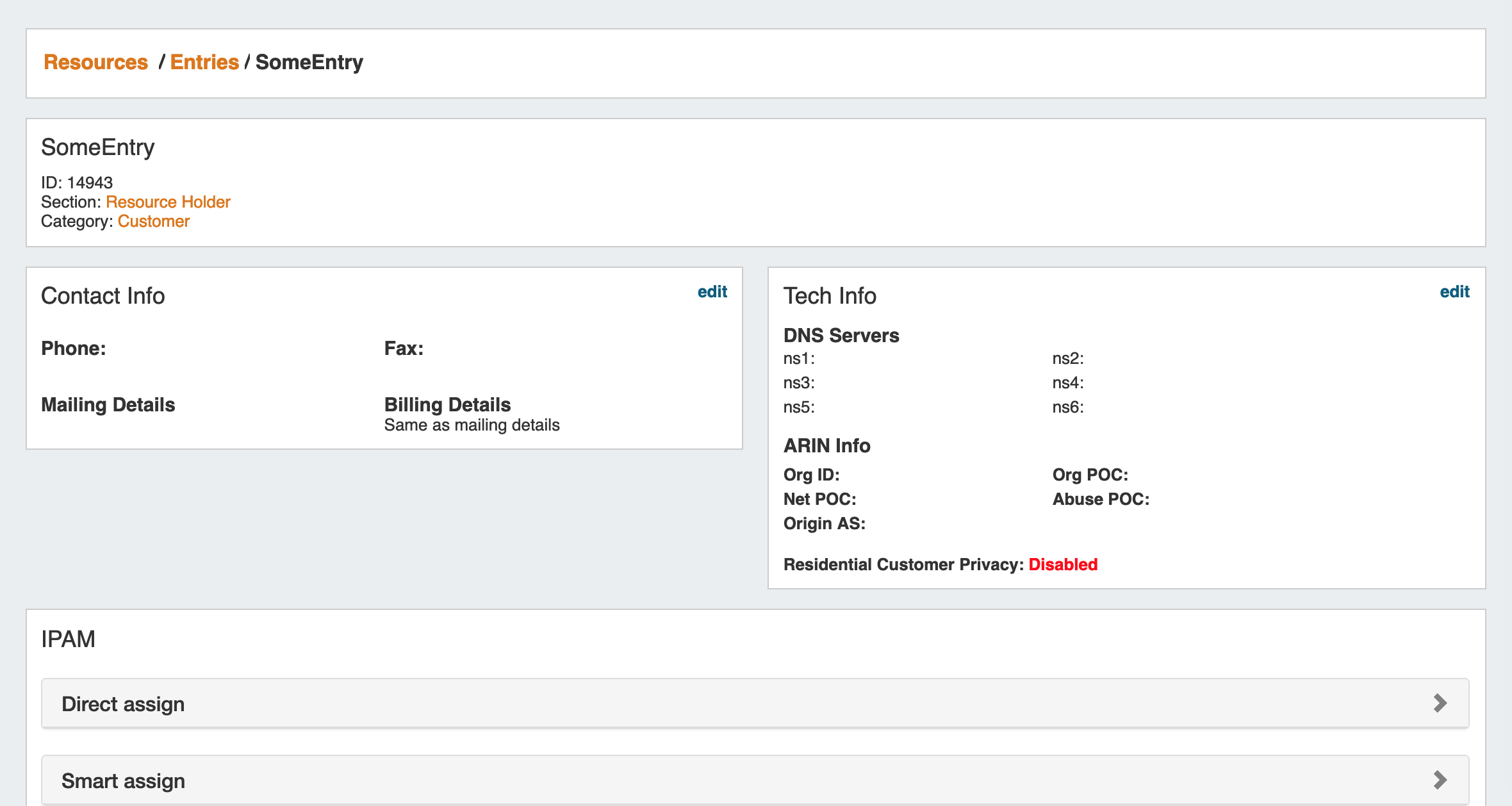 The Resource Entry Page displays details for an existing Resource and any associated Gadgets. Here, users may edit the Resource's fields, clone the resource, add child resources, and perform Gadget-level actions such as assigning and managing IPAM Blocks, Contacts, generate DNS Zones, and manage Peering Sessions.