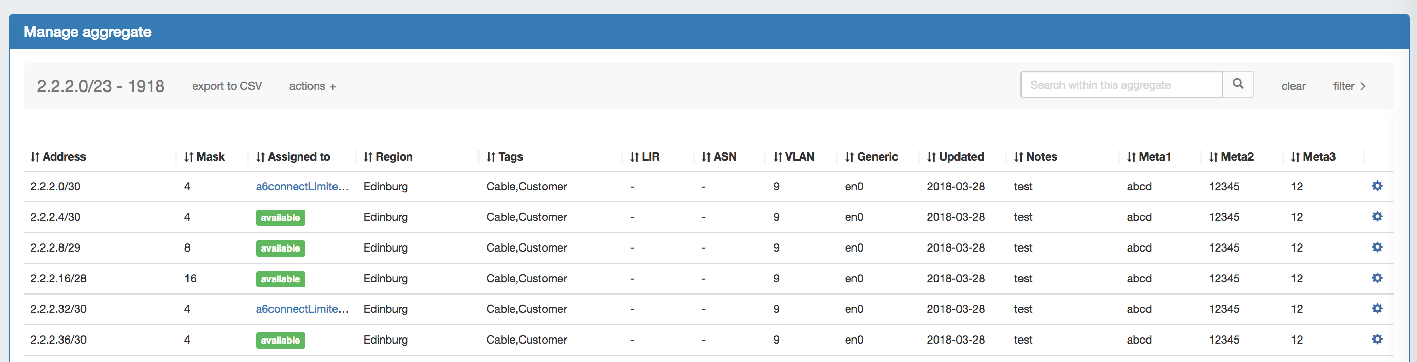 This will open IPAM Manage for all blocks in ProVision, with all the same filters, block edit functions, and search capabilities as in 'standard' IPAM Manage for an aggregate, but with no aggregate-level actions available.