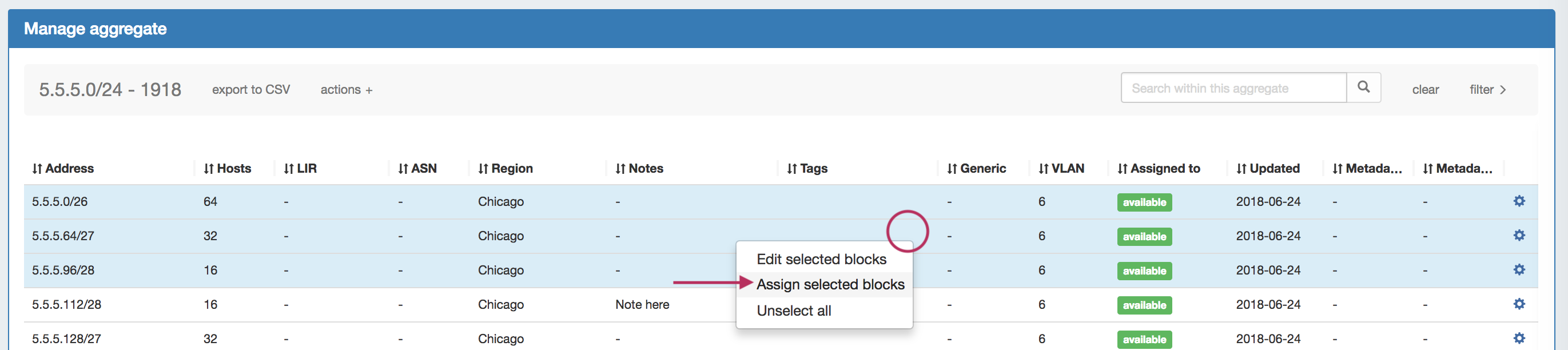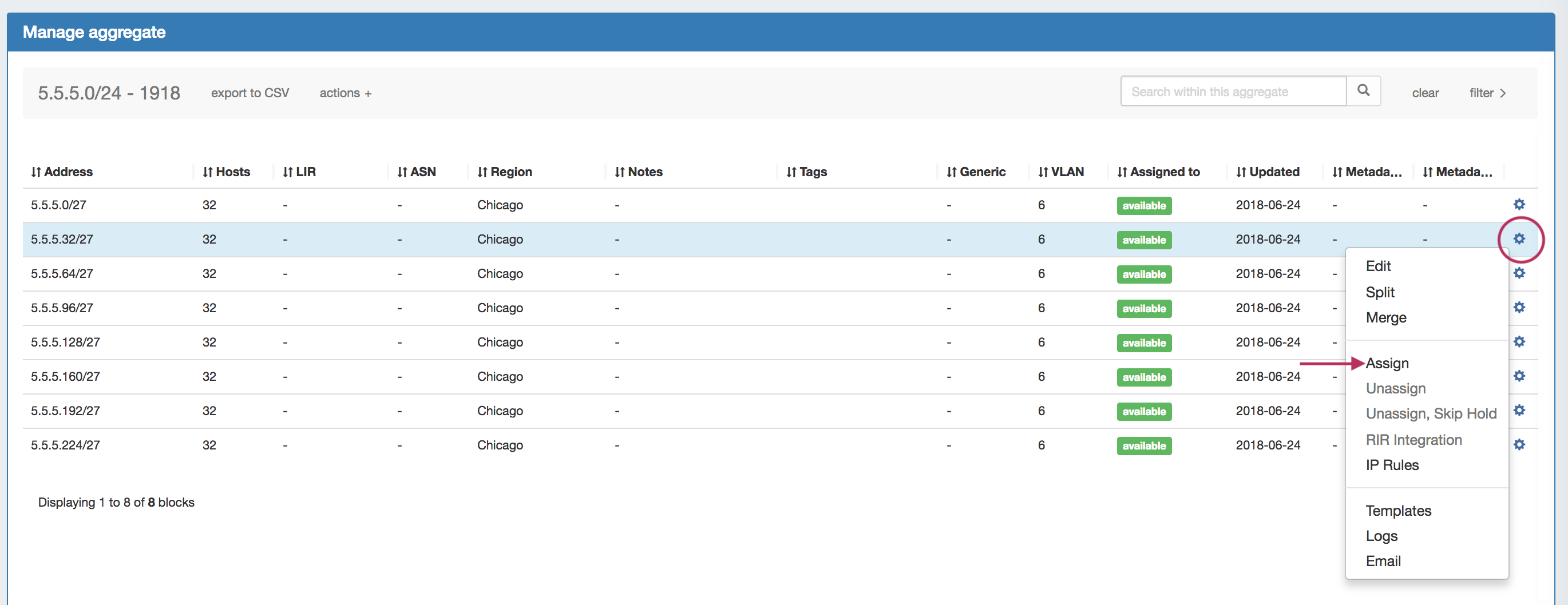 You can also assign blocks manually using the "Assign" function from the IPAM Manager screen (accessible from the IPAM Tab). Open the Action Menu for a block, then select "Assign".
