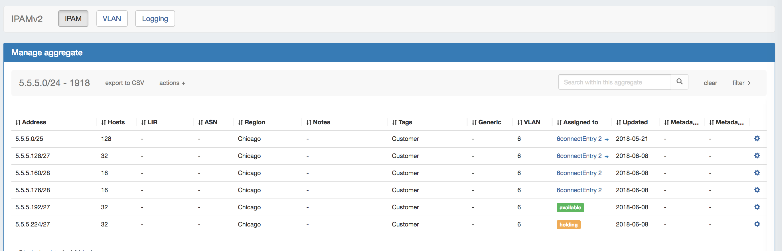 These actions are detailed on the (7.1.0-7.1.2) IPAM Tab page under Working with IPAM Aggregates. This page will focus primarily on block-level actions and management.