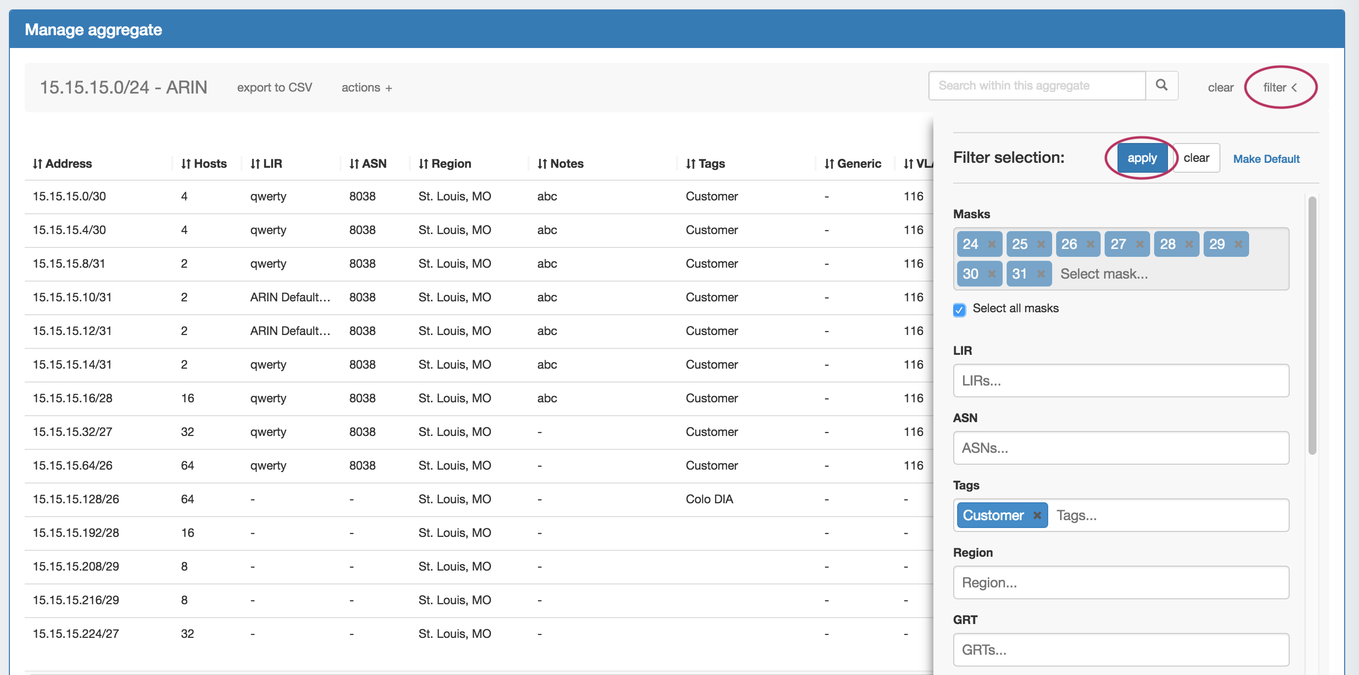 Filter the block list in IPAM Manage by toggling the "Filter +" link in the top right corner of the aggregate header.